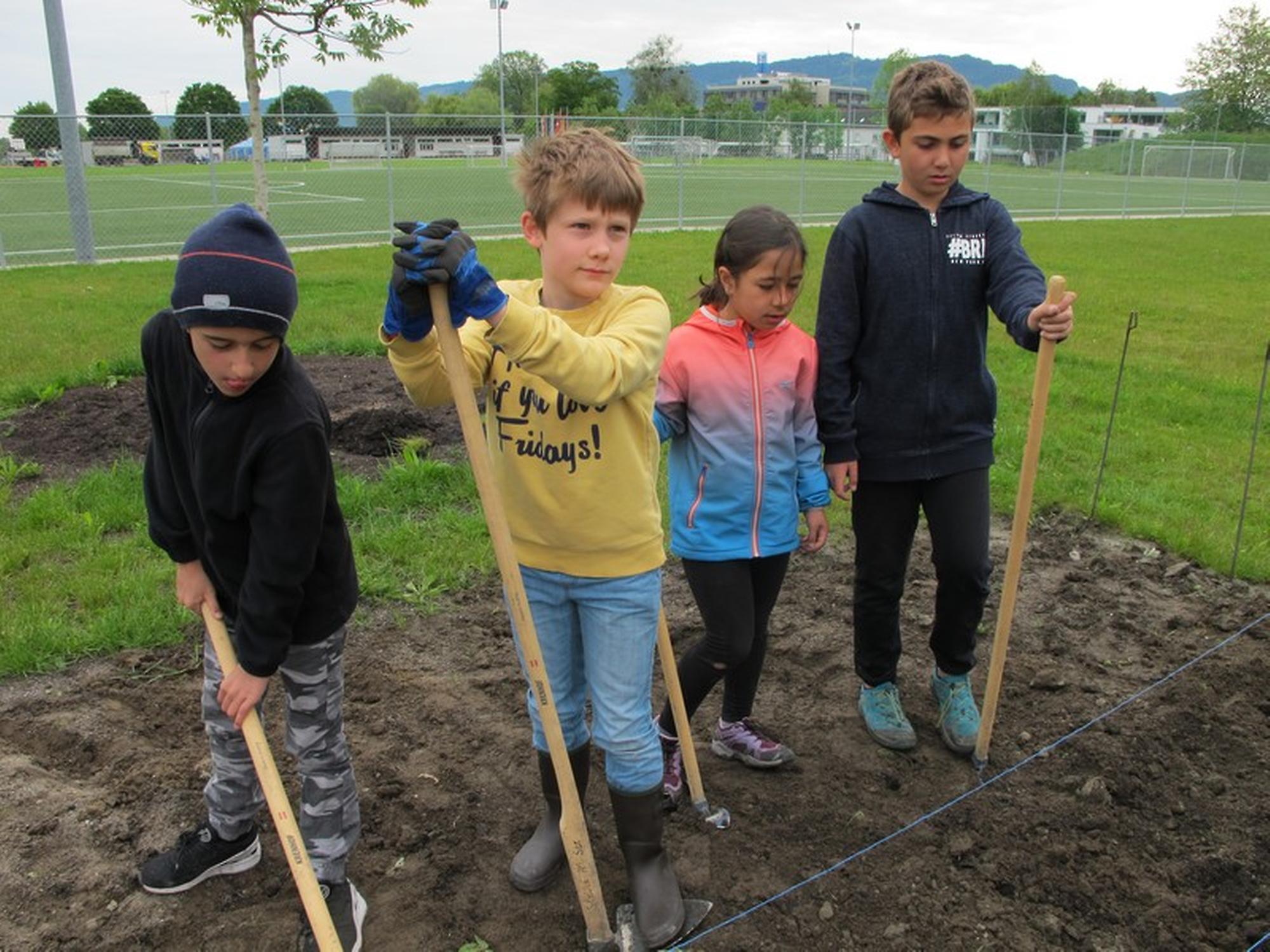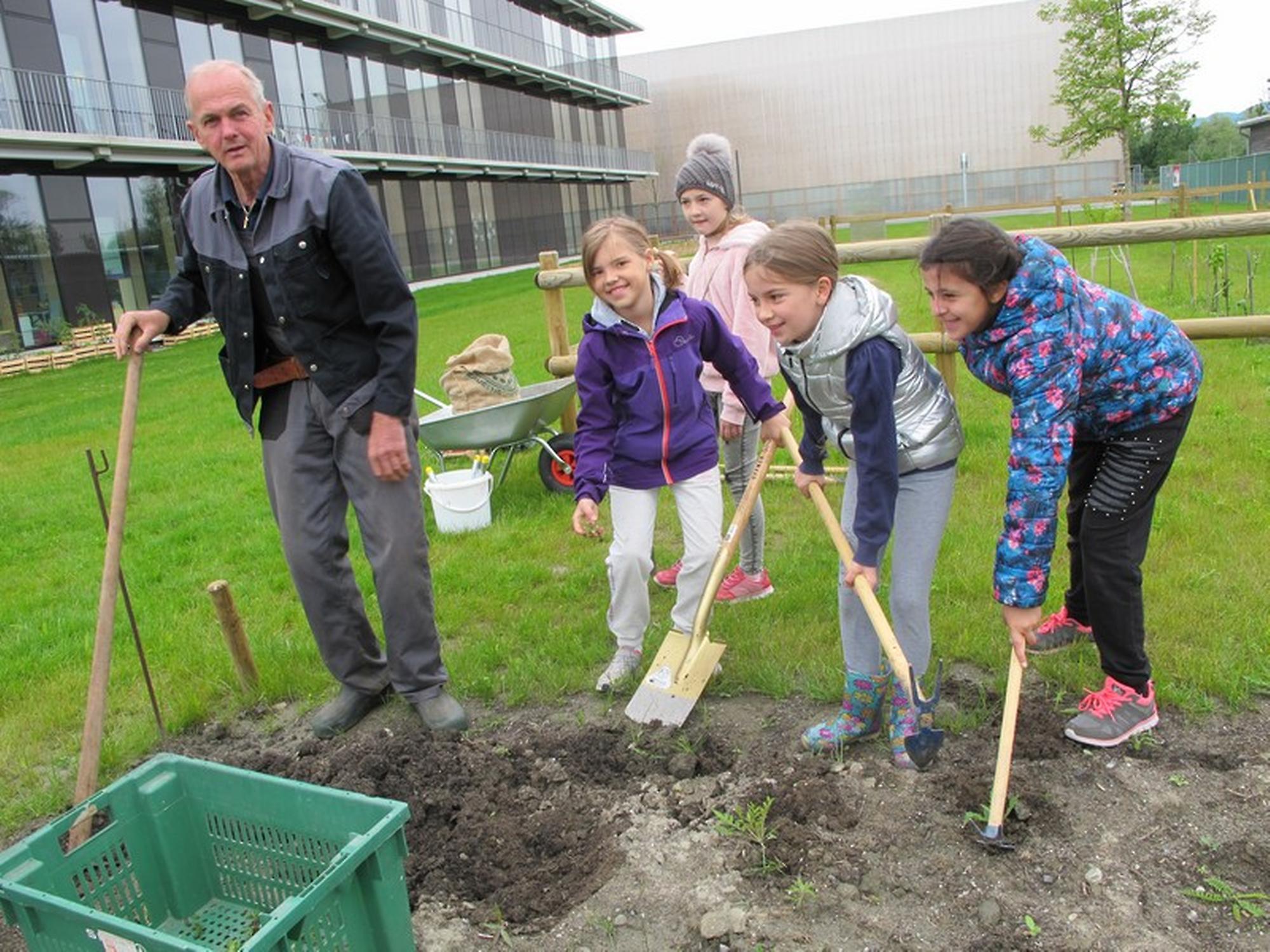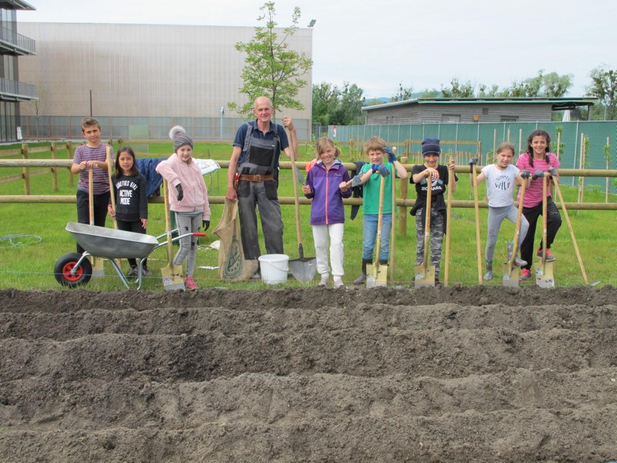 Einen Vormittag verbrachten die Kinder mit Siegfried Rohner, der mit ihnen den schuleigenen Kartoffelacker bepflanzte. Siegfried erklärte ihnen, wie Kartoffeln wachsen und anschließend wurde fleißig gejätet, umgegraben und gepflanzt. Jetzt warten wir und hoffen, dass die Kartoffeln gut wachsen, damit wir im Herbst eine reiche Ernte um Schulrestaurant verarbeiten können.