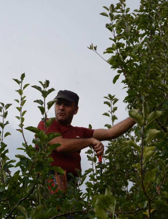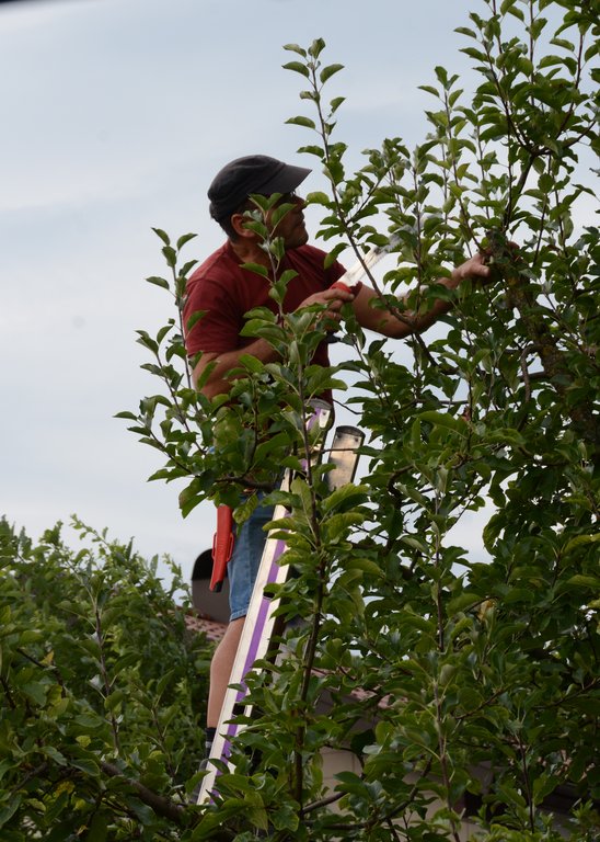 Nach der Theorie ging es zum praktischen Teil über. Obstbäume werden mit einem behutsamen der Jahreszeit entsprechend angepassten Schnitt wieder in Form gebracht, wobei die drei Aspekte LUFT – LICHT – SONNE im Vordergrund stehen. Die Behandlung des Baumes geht von oben nach unten und von außen nach innen. Ein Zweck des Sommerschnittes ist es den Baum in seinem Wuchs zu beruhigen und auszulichten um Pilzkrankheiten vorzubeugen. Der Sommerschnitt wird bei stark wachsenden Obstbäumen immer wichtiger. Er bremst das Wachstum, führt zur Bildung neuer Fruchttriebe und sorgt bei Äpfeln außerdem dafür, dass die vorhandenen Früchte besser ausreifen.