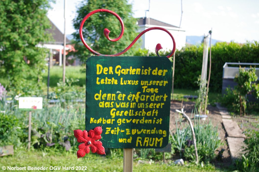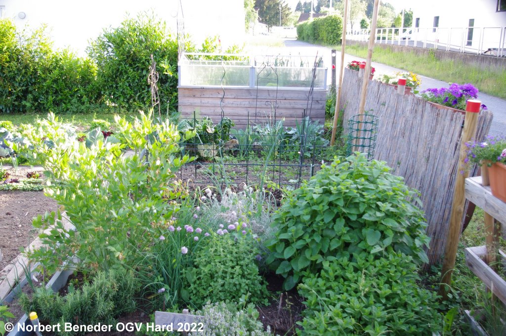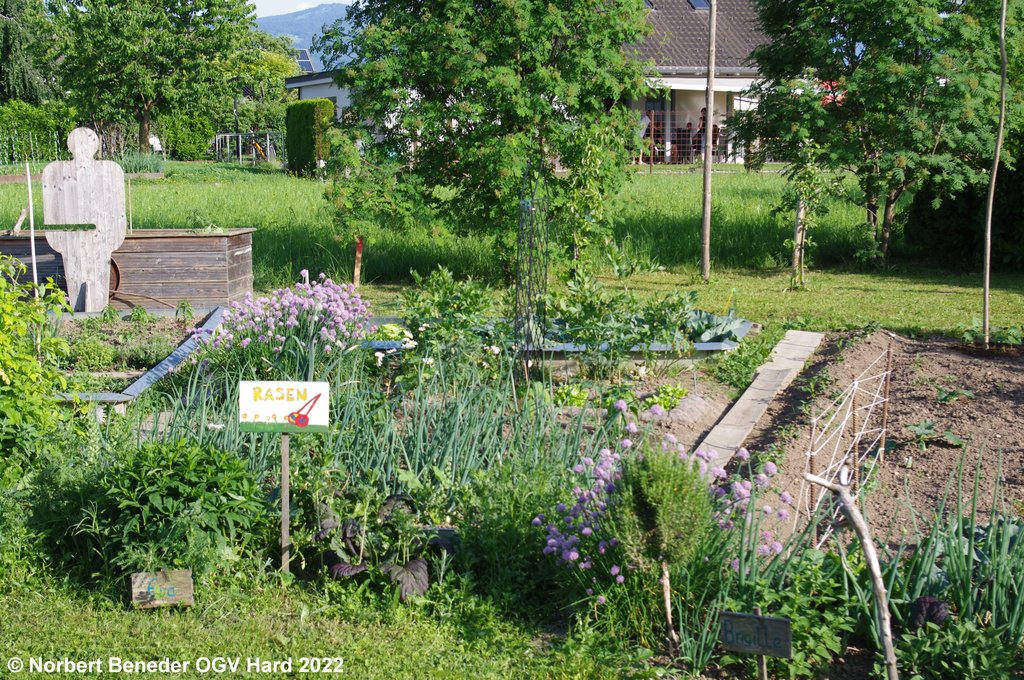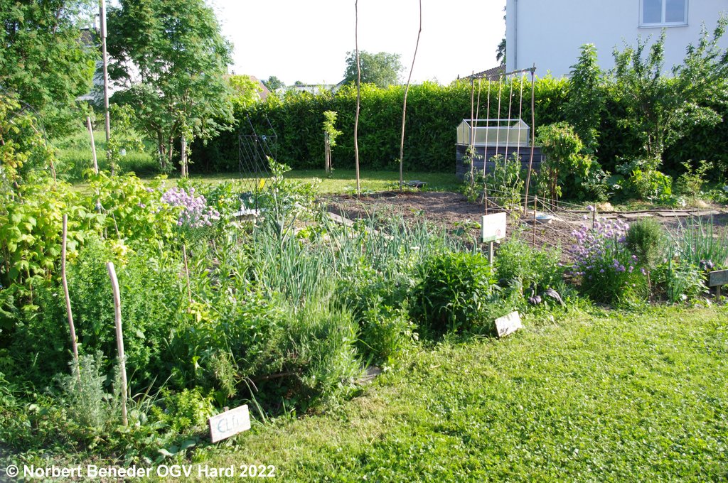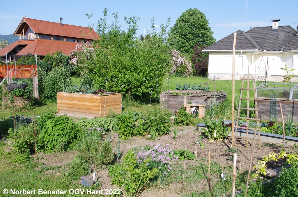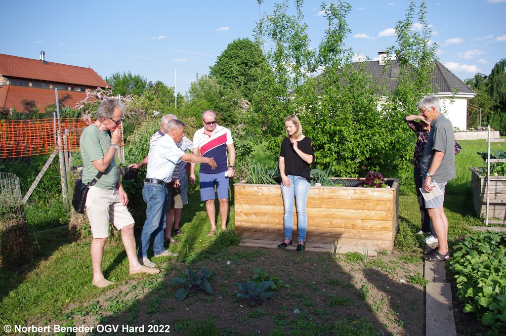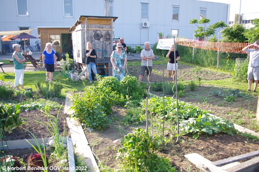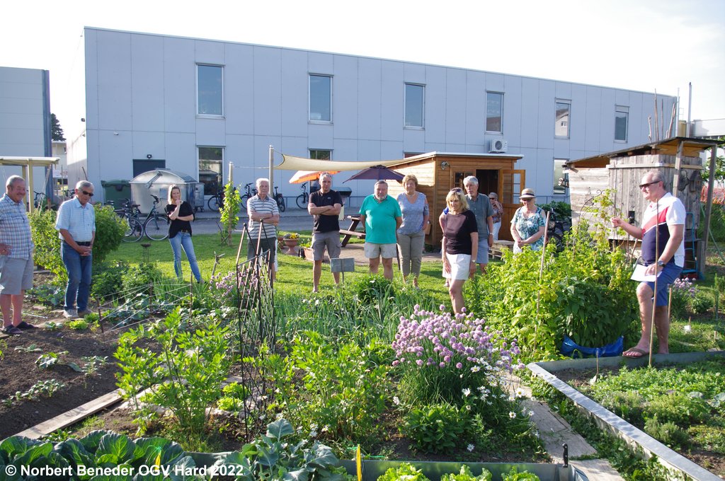 Gebhard Bechter, der selber einen Gartenteil betreut, stellte das Projekt vor. Gegründet vor 6 Jahren hat sich die Anlage auf 10 Beete ausgeweitet. So unterschiedlich die Gartenbesitzer sind, so unterschiedlich sind auch die Beete. Der Name Sonnengarten ergibt sich aus den strahlenförmig angelegten Beeten in dessen Mitte sich das Werkzeughaus und der Sitzplatz befinden. Der soziale Aspekt mit der Gemeinschaftspflege ist auch ein wesentlicher Kern dieser Projektes.
