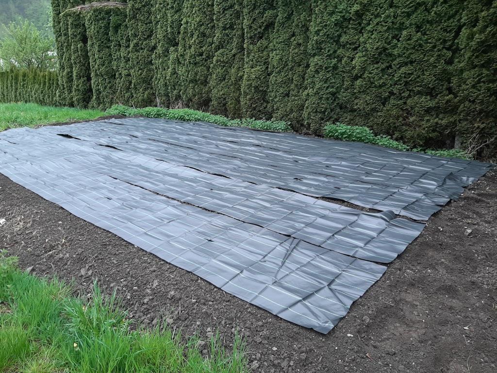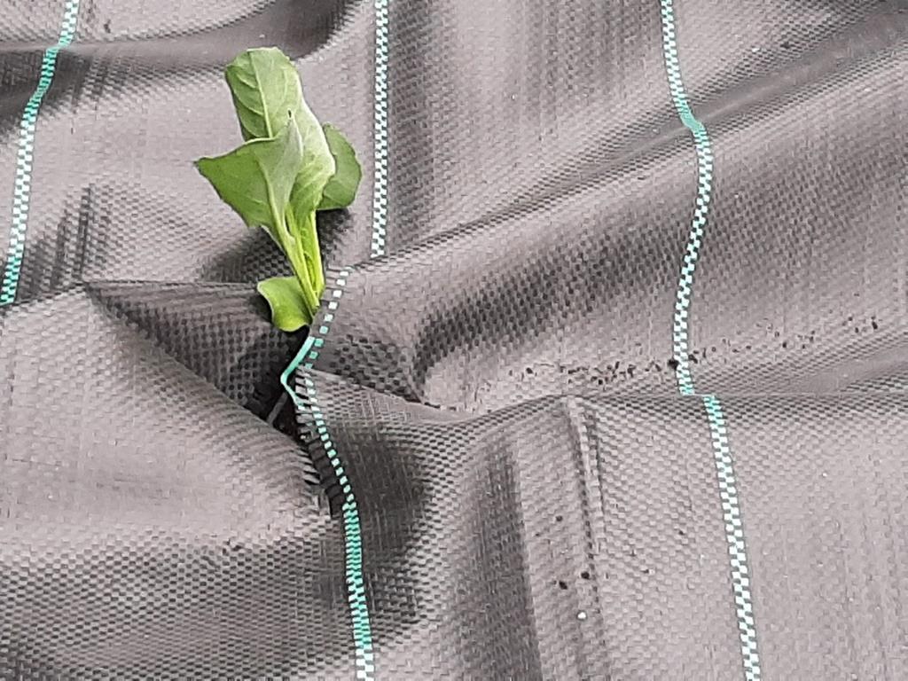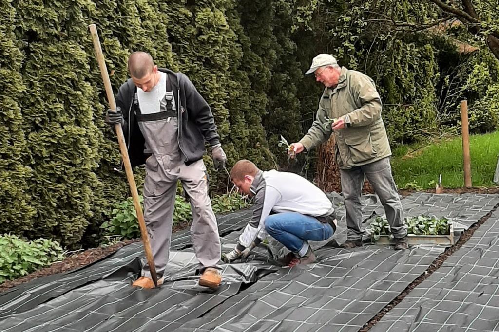 Nun konnte eine Matte aufgelegt werden, die das Wachsen von Unkraut verhindern soll. In die Matte wurden Schnitte gemacht, wodurch dann die rund 100 Setzlinge in die Erde gesteckt wurden.