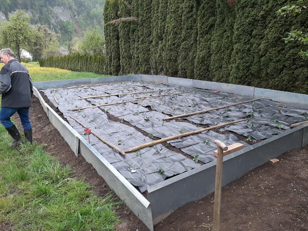 Nach dem Setzen wurden Bleche um den Acker gesteckt, damit die Schnecken nicht mehr zu den Krautköpfen gelangen können.