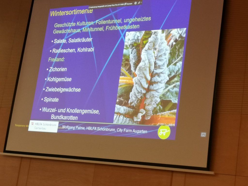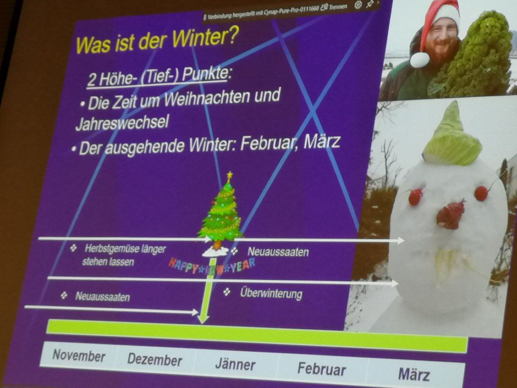 Für viele bedeutet Wintergemüse nur Zuckerhut, Endivie, Sprossenkohl und andere Kohlarten. Wolfgang zeigte mit beeindruckenden Bildern, was es für weitere Möglichkeiten gibt, um auch in der sogenannten „toten Jahreszeit“ dem Winter, erntefrisches, vitaminreiches Gemüse und Salate auf den Teller zu bringen. Viele Gemüsesorten, Salate, wie Asia-Salat, Wasabi, Pak Choi, Vogerlsalat, und nachgereifte Tomaten aus dem eigenen Garten könnten unseren Festtagstisch an Weihnachten zu einem absoluten Highlight machen. Dabei ist es wichtig, diese Pflanzen zum richtigen Zeitpunkt auszusäen oder zu pflanzen. Überrascht hat uns die Aussage, dass viele Pflanzen wesentlich frosthärter sind als dies angenommen wird. So können z.B. auch Zuckererbsen und Radieschen ohne weiteres im Frühbeet-Kasten schon im Winter ausgesät werden.
