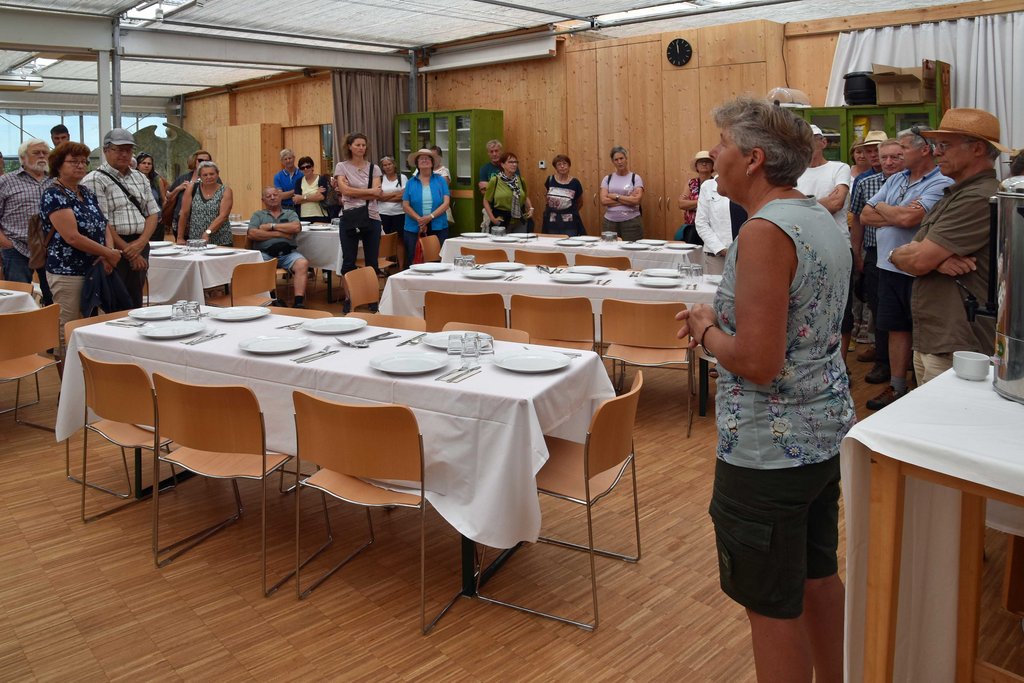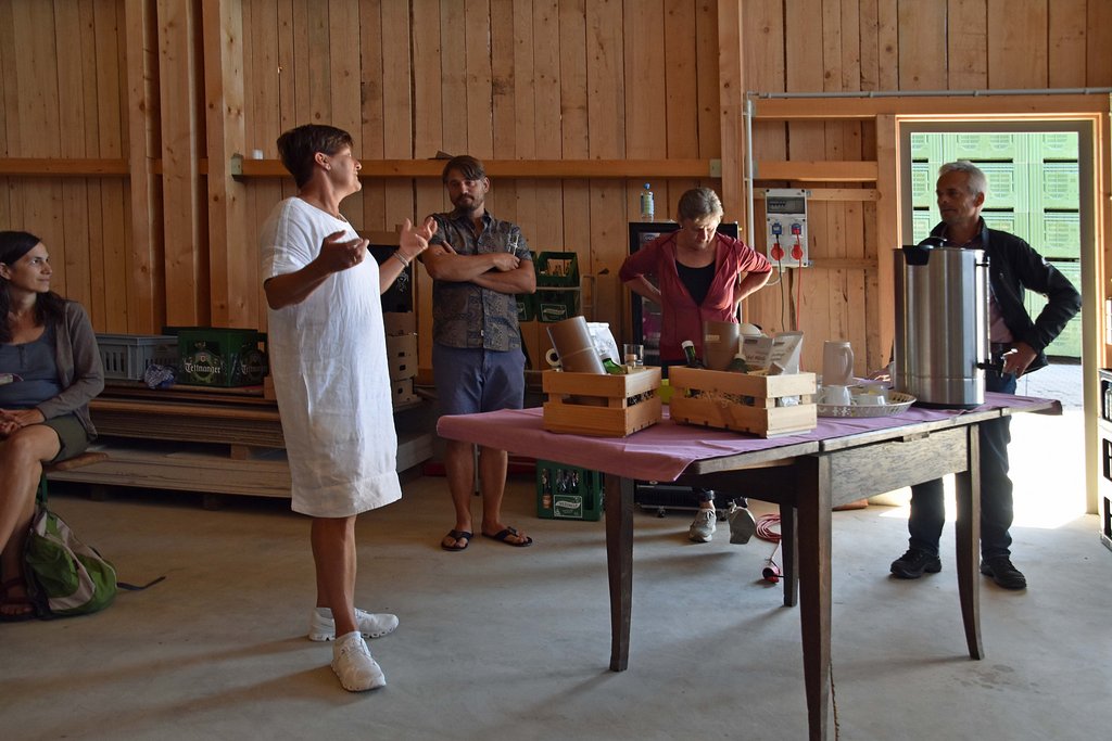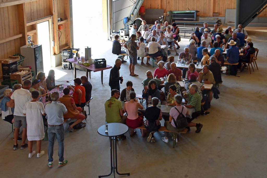 Unser Weg führte uns zuerst nach Tettnang/Apflau, wo wir nach einer feinen Frühstücksjause auf dem Demeterhof Bentele viel Wissenswertes zum biologischen Hopfenanbau erfuhren. 17 ha Hopfen sowie 17 ha Äpfel werden hier angebaut und durch Wildhecken und Blühstreifen ergänzt. Zum Abschluss konnten wir bei einer kleinen Bierverköstigung den Hopfen auch in flüssiger Form genießen.