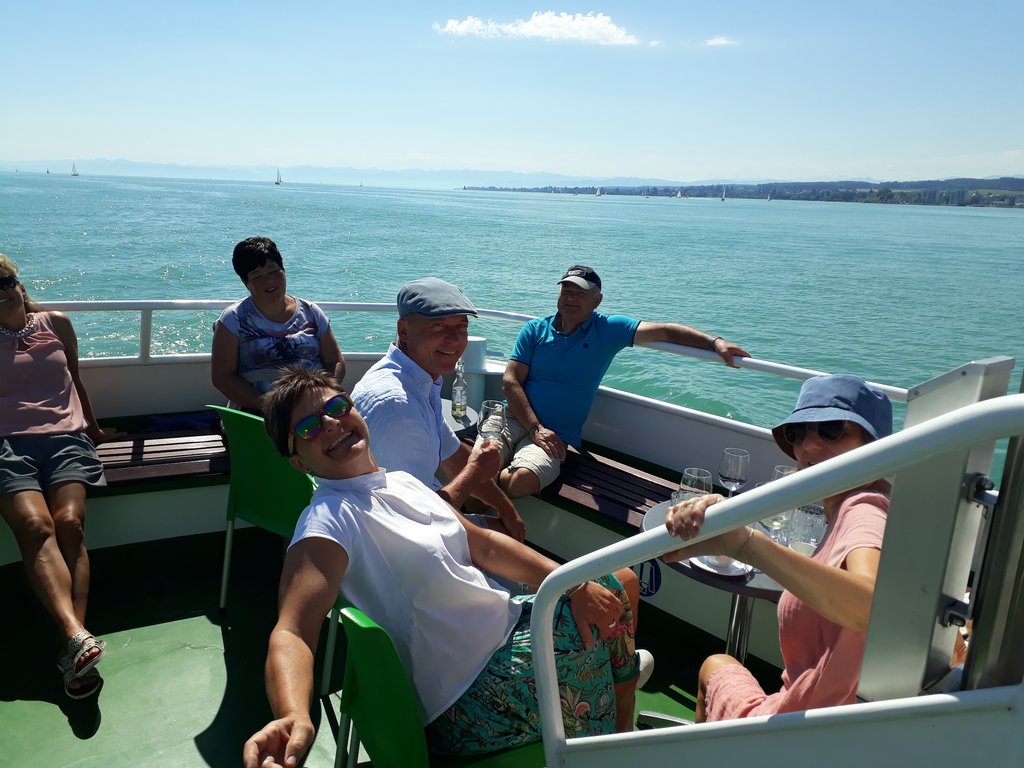 Für Sonntagmorgen hatte Renate eigens für uns ein Schiff gechartert. Bei herrlichem Sommerwetter genossen wir die Überfahrt von Überlingen nach Konstanz bei feinen Häppchen und kühlen Getränken in vollen Zügen. Was für ein Morgen!!!