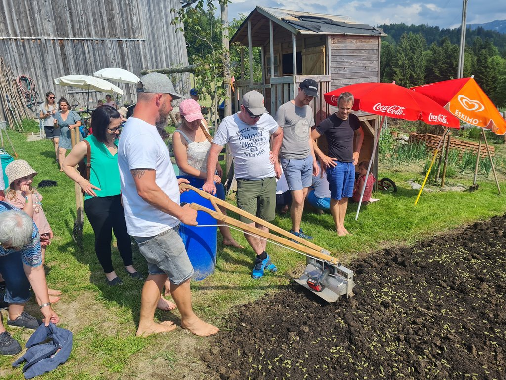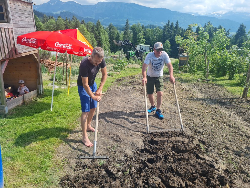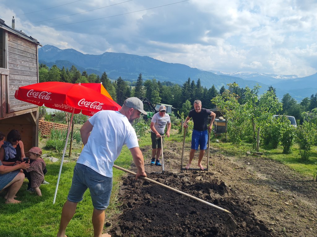 Für Klein und Groß war bestens gesorgt und das Wetter hätte mit strahlendem Sonnenschein und endlich frühsommerlichen Temperaturen nicht besser sein können. Wir bekamen einen Einblick wie Theresia und Bernd ihren Garten bewirtschaften und schließlich kamen auch ein paar Kursteilnehmer beim Beet anlegen etwas ins Schwitlzen. Aber sie hatten sichtlich Spaß dabei. Auch die Kinder waren schwer beschäftigt beim Spielen mit den Zwerghasen, Seilhüpfen oder Kinderschminken. Theresia hat uns noch mit selbst gemachten Selbstgemachtem verpflegt. Toll, dass wir bei ihnen zu Besuch sein durften. Wir bedanken uns für diesen schönen Nachmittag!