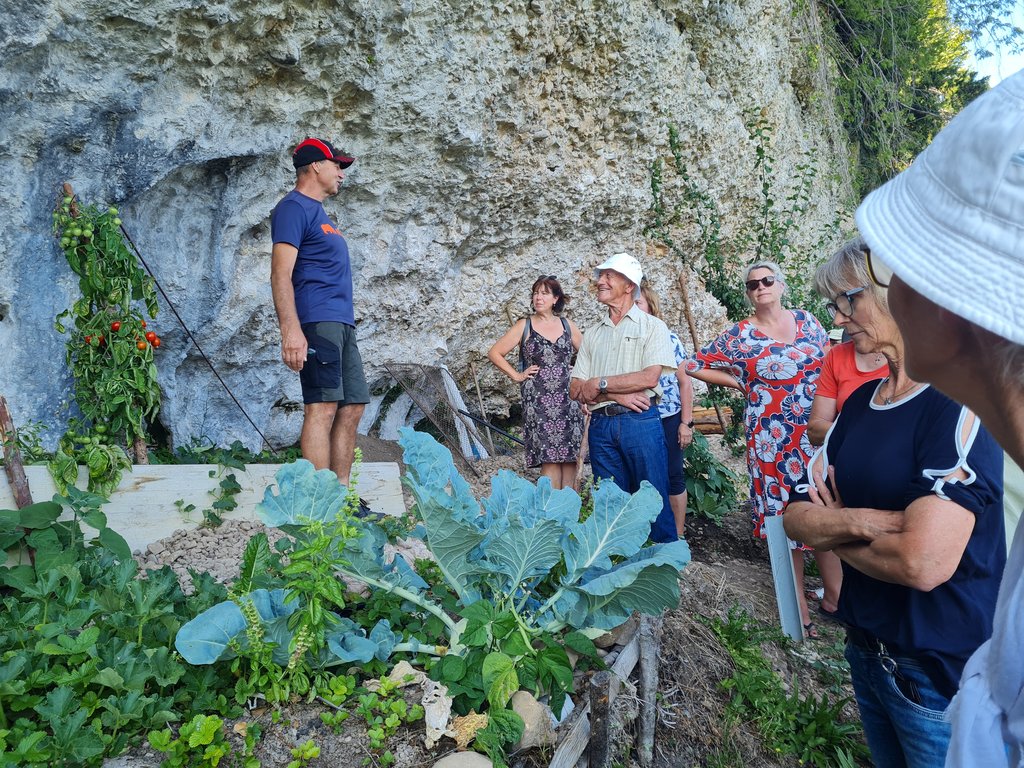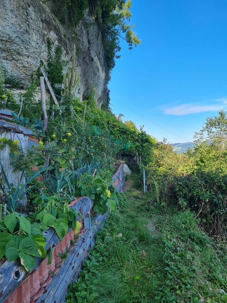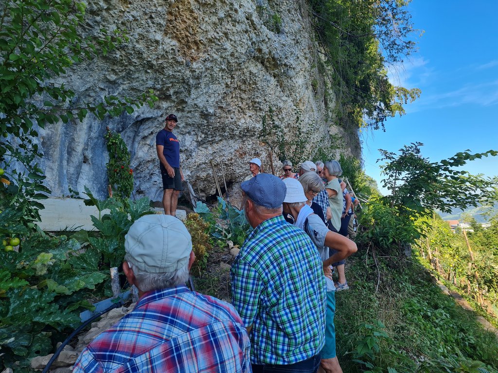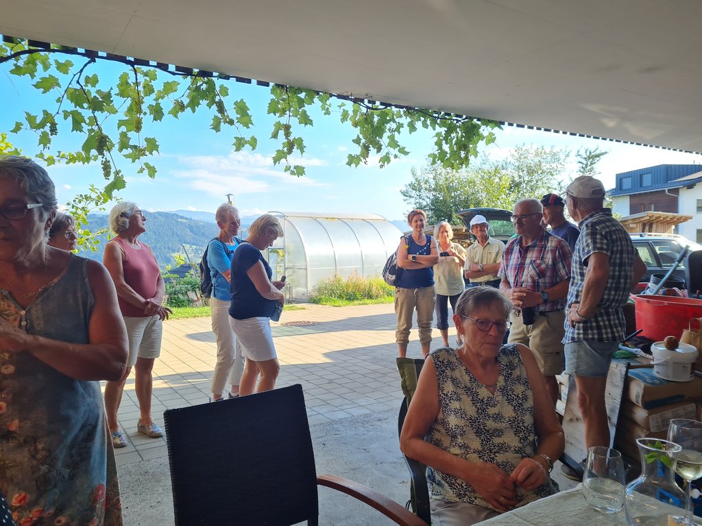 Trotz der Hitze folgten viele Interessierte den Ausführungen von Anton zum besonderen Hanggarten, den er nicht nur mit diversen Obstbäumen und Gemüse, sondern auch mit vielen Traubenstöcken bepflanzt hat. Von A wie Apfel bis Z wie Zuckermelone gibt es hier nach jeder Wiegbiegung wieder etwas zu entdecken.