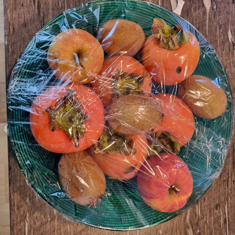 Kiwis und/oder Kakis zusammen mit Äpfeln in eine geschlossene Schale legen und mit Frischhaltefolie abdecken. Alternativ funktioniert auch ein Frischhaltebeutel. Nach etwa 10 bis 14 Tagen sind die Früchte reif und genussfertig.