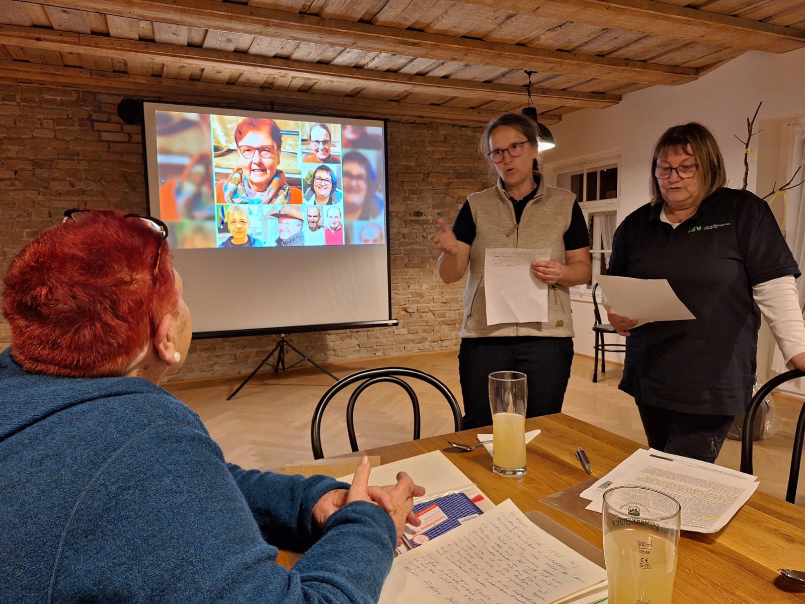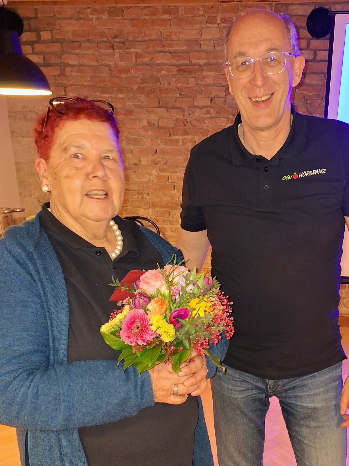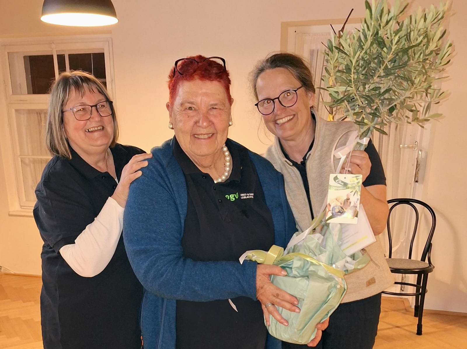 Angelika und Melitta geben einen amüsanten Rückblick auf Ruths jahrzehntelange Zeit im Verein, ernennen sie zur Ehrenobfrau und überreichen der Geehrten ein Olivenbäumchen. Ruth Heidegger begrüßt den inzwischen dazugestoßenen BM von Hohenweiler, Wolfgang Langes. BM Wolfgang Langes begrüßt die Anwesenden und schließt sich den Ehrungen an. Er dankt Ruth Heidegger für ihre Loyalität und Unterstützung als Obfrau des Vereins und überreicht ihr eine Anerkennung von Seiten der Gemeinde. Bernd Pulsinger dankt Ruth für die langjährige Zusammenarbeit mit dem OGV Hörbranz und überreicht ihr ebenfalls ein Geschenk. Der Bezirksvertreter des OGV Landesverbandes Martin Bereuter dankt Ruth für die gute Basisarbeit in der Region.