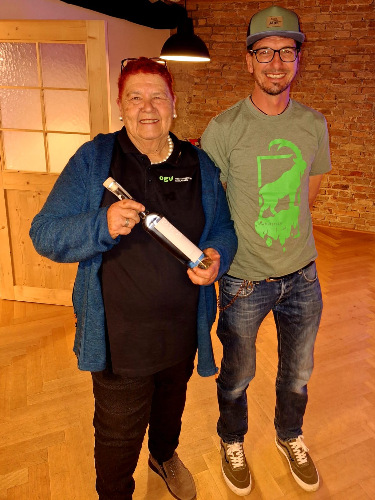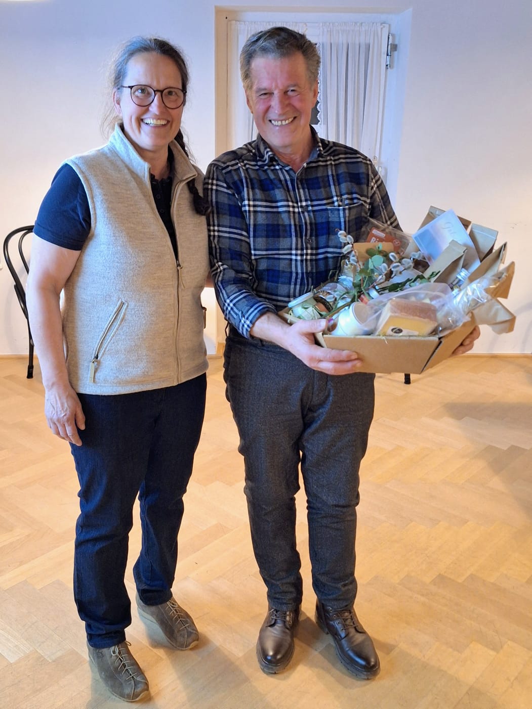 Ruth Heidegger erzählt so manche Anekdote und dankt Alois für die Hilsbereitschaft in jeglicher Form. Sie überreicht dem Geehrten einen besonderen Zwetschkenbaum: veredelt mit 4 verschiedenen Sorten. Melitta überreicht Alois einen Geschenkkorb mit allerlei Schmackhaftem als Gruß des Bürgermeister Lukas Greussing von Mögger. Alois bedankt sich bei beiden Überreicherinnen und wünscht allen weiterhin viel Freude beim Gärtlern und „Tua“.