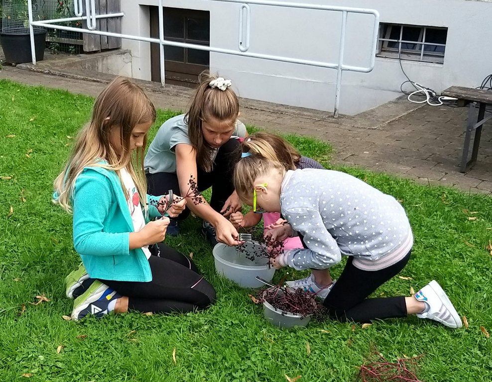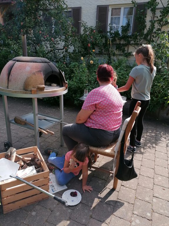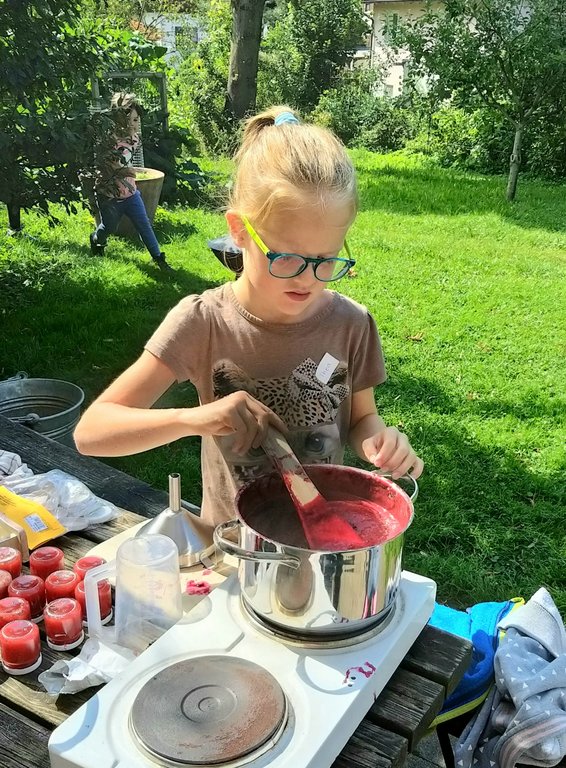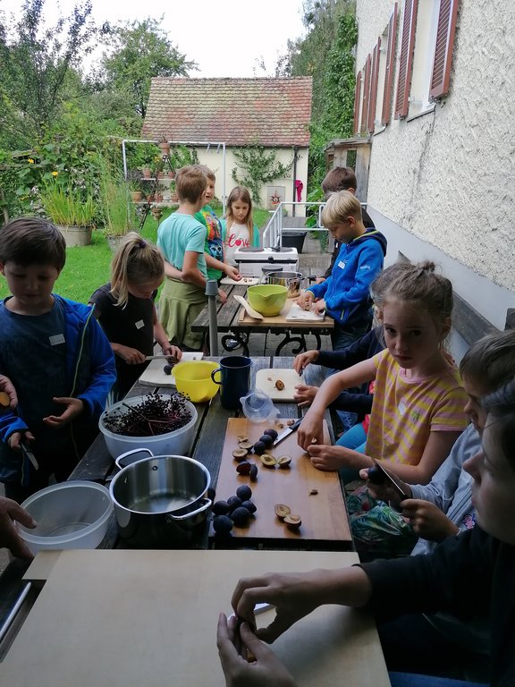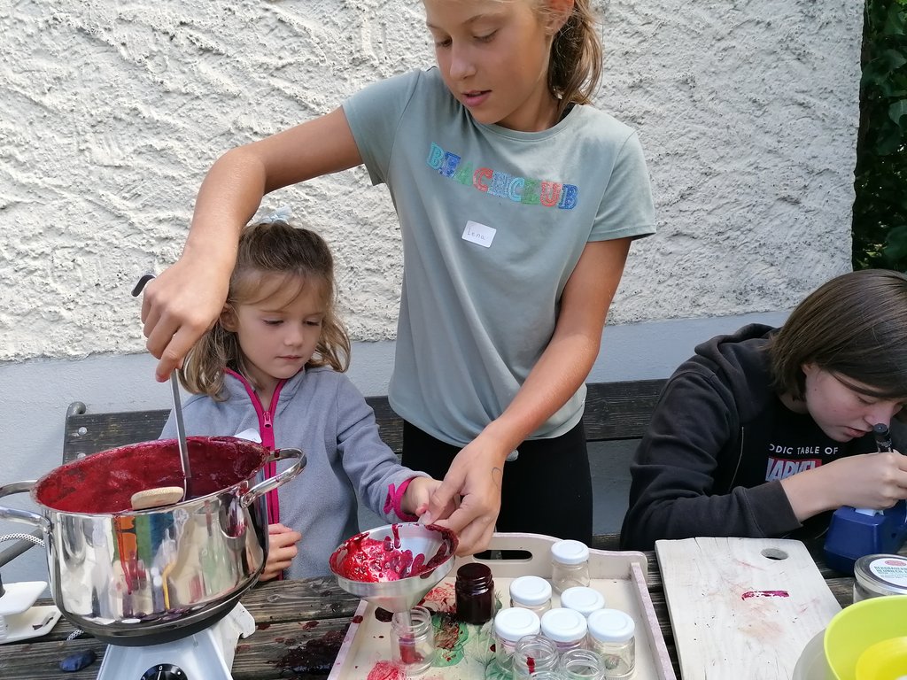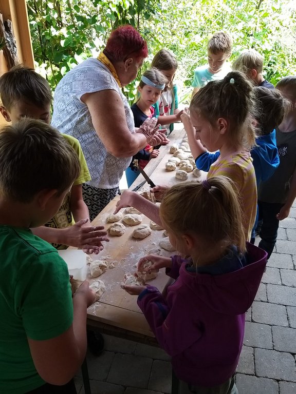 Heuer haben uns 14 Kinder ab 4 Jahre im Garten besucht. Es war eine nette Gruppe. Als erstes haben die Kinder den Teig gemacht. Während der Teig ruhte haben sie Zwetschgen, Äpfel, Brombeeren und Holunder gesammelt, kleingeschnitten und zu Marmelade verarbeitet. Es wurden auch für jedes Kind Kostproben der Marmelade zum Mitnehmen abgefüllt. Nun war der Teig fertig und die kunstvoll geformten Brötchen wurden von Martina in den Ofen geschoben. Jetzt gab es die große Kostprobe frisch gebackenes Brot mit dem fruchtigen Aufstrich. Und natürlich haben die Kinder wieder die weltbeste Marmelade hergestellt. Danke Ruth und Ronja für die große Hilfe 😉