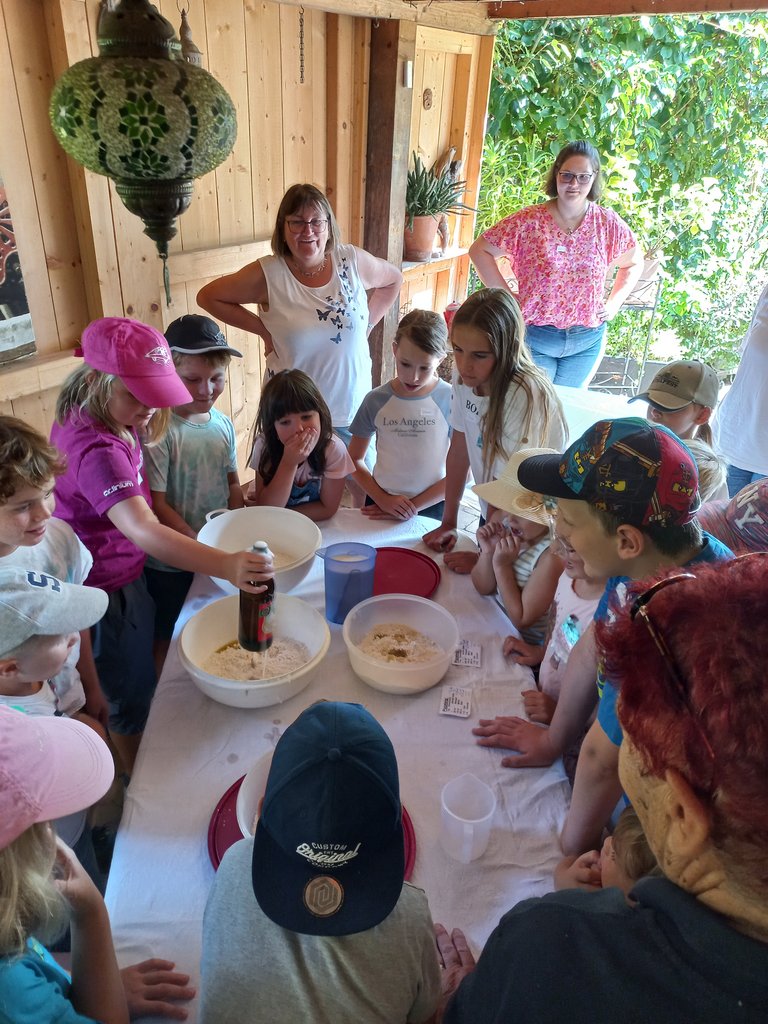 Wir haben als Erstes mit Dinkelmehl Teig für das Brot gemacht. Direkt im Garten wurden süße Birnen und leckere Zwetschgen für Marmelade gesammelt und Butter aus Sahne geschüttelt. Elisabeth heizte währenddessen den Holzbackofen.