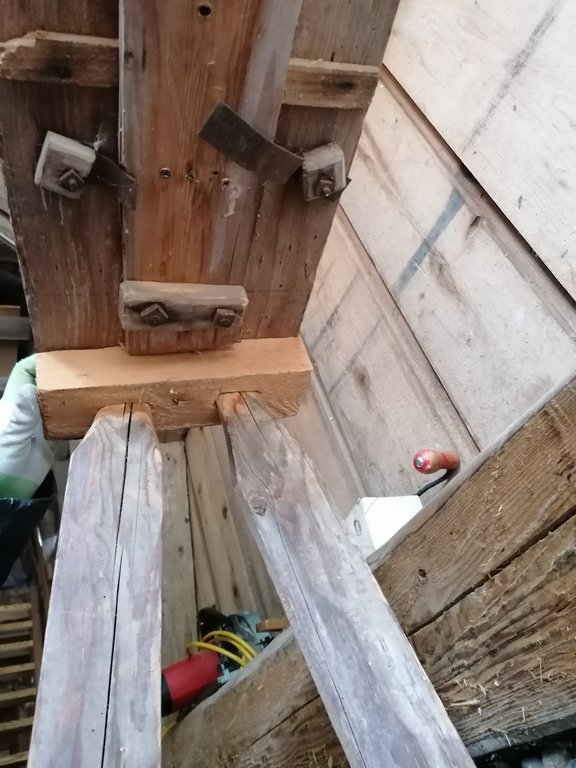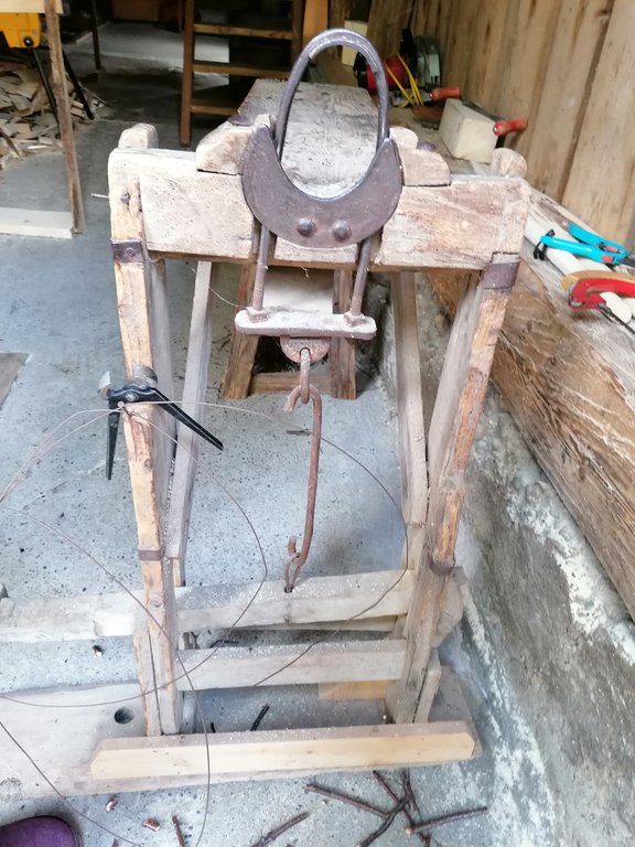 - Das Reisigbündel wird nun in die Öse des Bocks gesteckt und mit drehender Bewegung immer wie gepresst und durch die Öse geschoben. Josef hat bei seinem Bock die Möglichkeit mit dem Fußpedal das Reisig zusammenzupressen. Steht das Reisig ca. 10 cm vor, wird es mit Draht (2 fach gewickelt) zusammengebunden, die Drahtenden (ca. 1,5 cm) werden zusammengedreht und in das Büschel geklopft, damit man sich nicht verletzen kann.