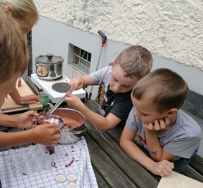 Zwischendurch wurden noch zwei verschiedene Marmeladen mit Obst, frisch aus dem Beerenarten, hergestellt. Der Besuch bei den Hühnern bzw. im Hasengehege durfte natürlich auch nicht fehlen.