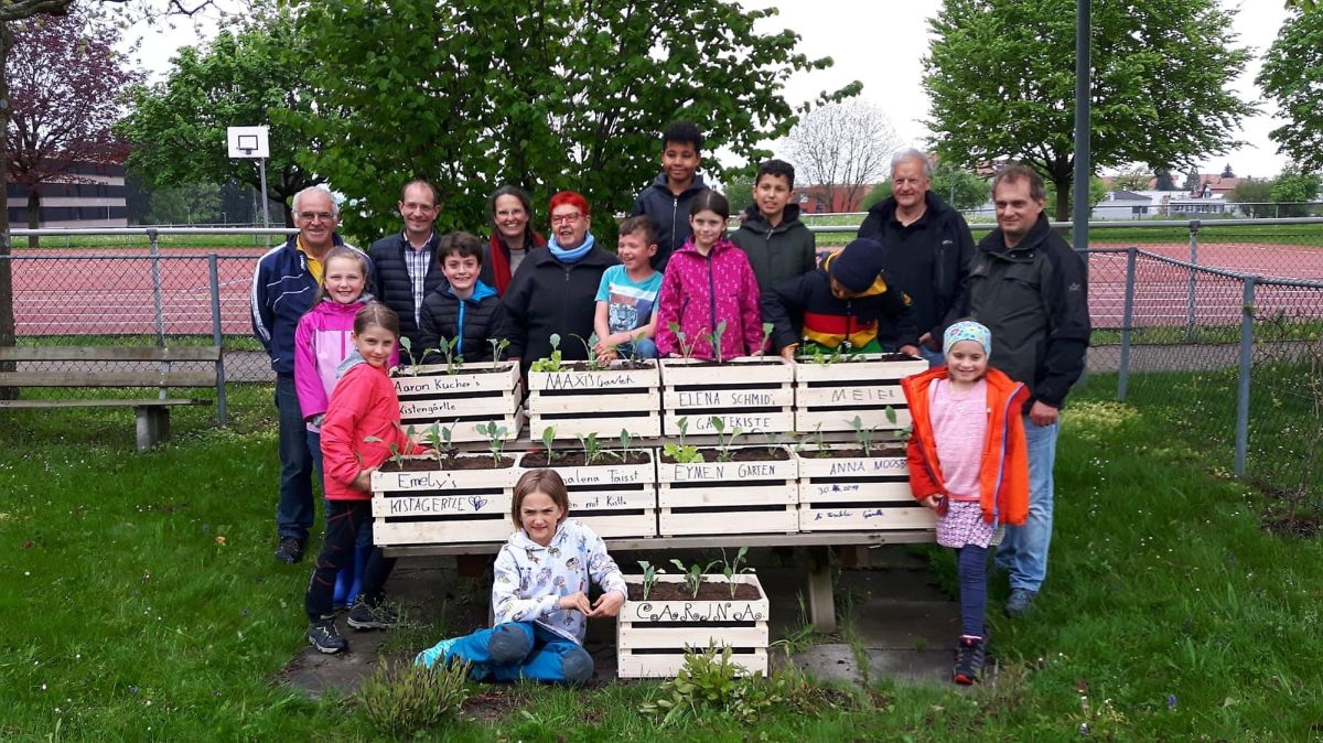 Draußem im Schulgarten wurden dann, unter Anleitung von Ruth, die Kisten mit Erde befüllt und individuell bepflanzt.
