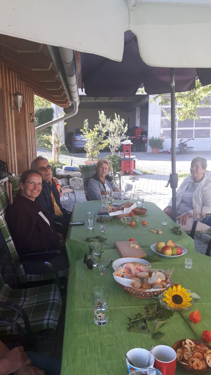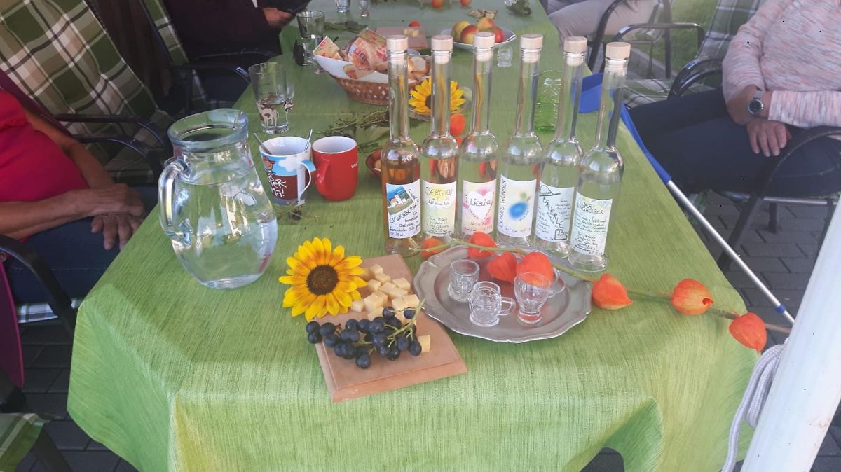 Bei einem gemütlichen Gartenhock kredenzte Erwin uns seine wunderbaren Schnäpse zu Käse aus eigener Milch, von der Kuh mit Horn, der schon als bester Käse Österreichs ausgezeichnet wurde und zu Trauben aus seinem Garten.