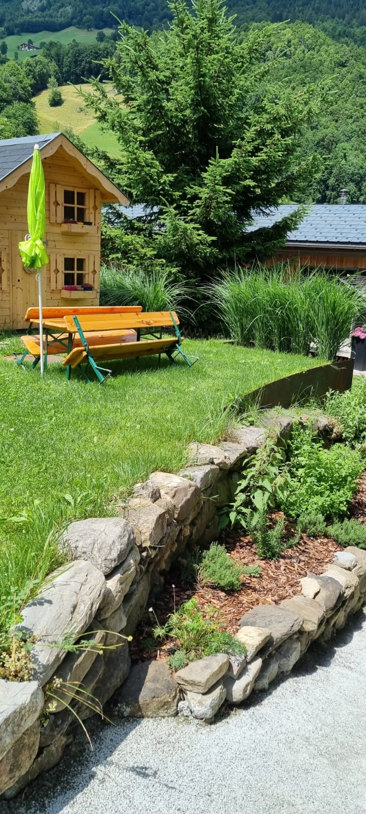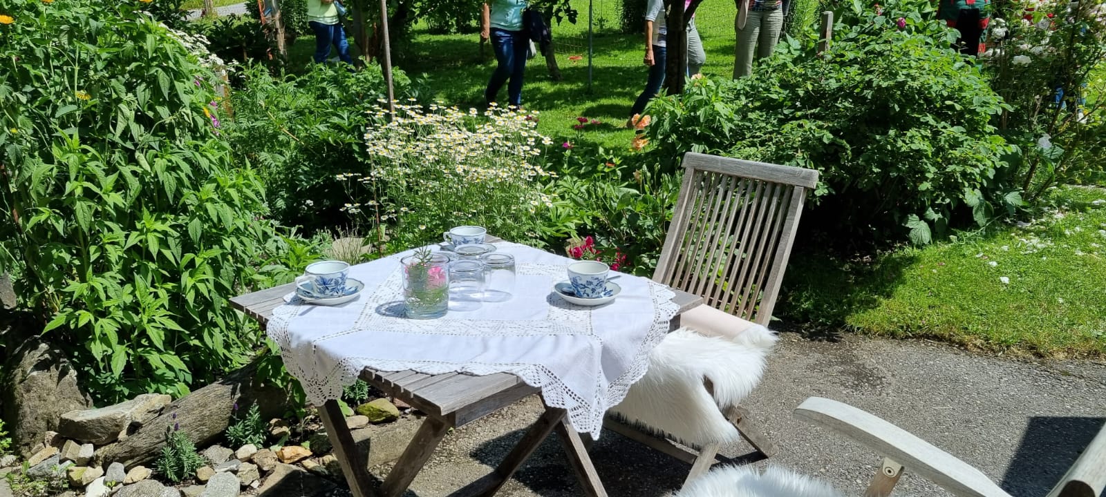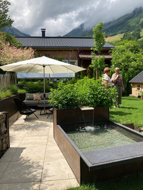 Am Samstag, 1. Juli fuhren wir gemeinsam mit dem Linienbus von Mellau nach Au und besuchten dort zuerst Veronika und Daniel Hauser. Hier durften wir tolle selbstgemachte Natursteinmauern, Beeren, Kräuter, ein Gemüsehochbeet und vor allem auch ein Wasserbrunnen inmitten wunderschöner Hortensien und Gräser betrachten.