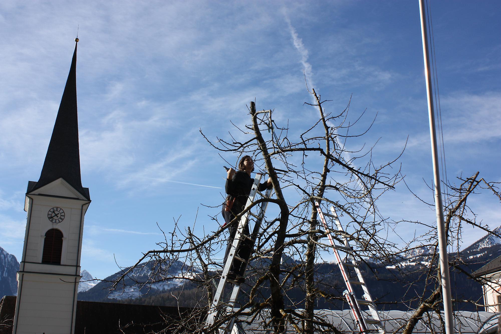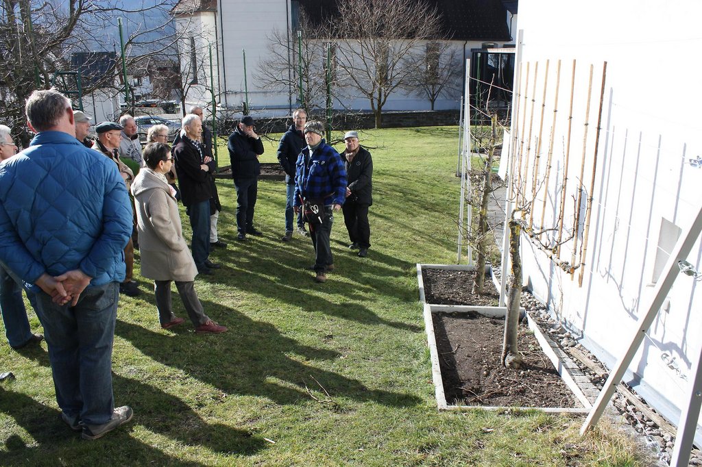 Die nächste Station war im Pfarrgarten in Nüziders: Nach der theoretischen Erklärung über die verschiedenen Baumformen erfolgte die praktische Umsetzung an einem Halbstamm und im Gemeindebongert wurde der Erziehungsschnitt an Hochstämmen gezeigt.
