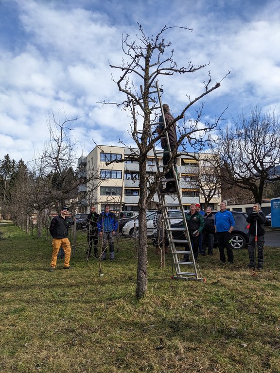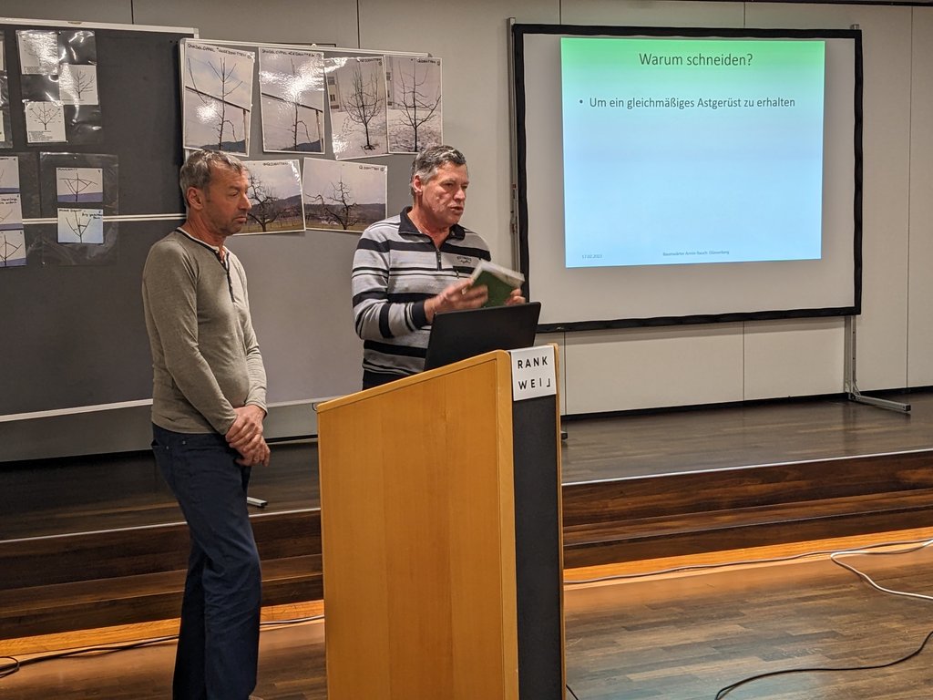 Die Baumwärter Armin Rauch und Lothar Lins waren die kompetenten Wissensvermittler. 20 Frauen und Männer trafen sich am Freitag zum theoretischen Teil und am Samstag zur praktischen Übung. Bei allen Anwesenden war das Interesse an der Obstbaumkultur spürbar. Die richtige Pflege der eigenen Bäume und die Nutzung der verschiedenen Früchte sind bei den Menschen wieder sehr wichtig. Dieses Interesse wird vom Obst- und Gartenbauverein entsprechend begleitet und gefördert.
