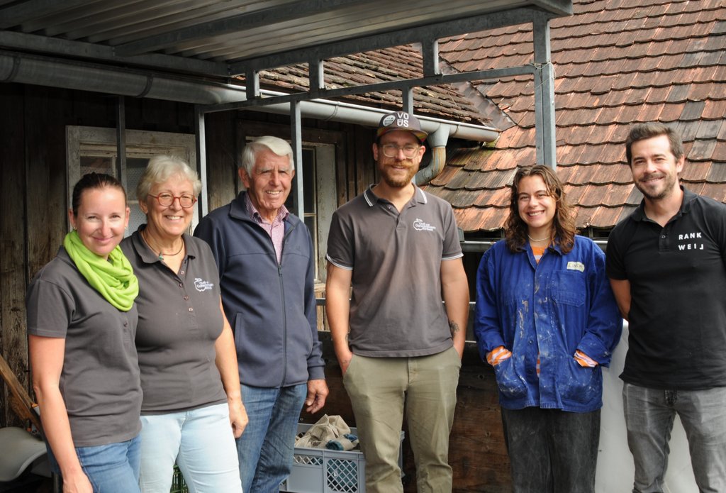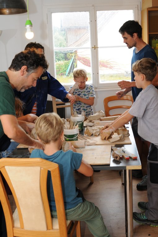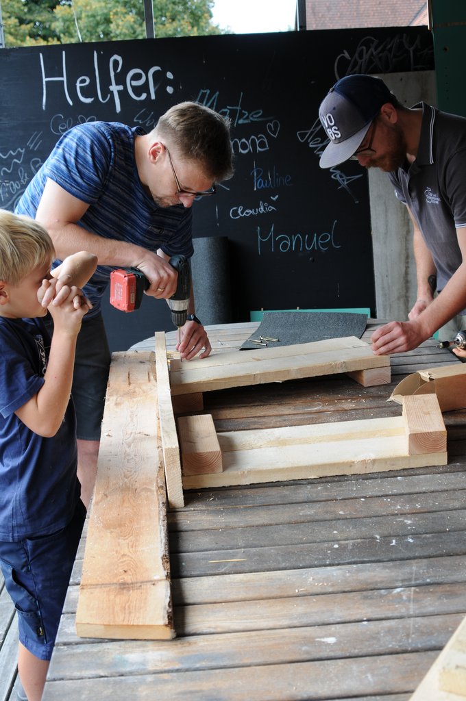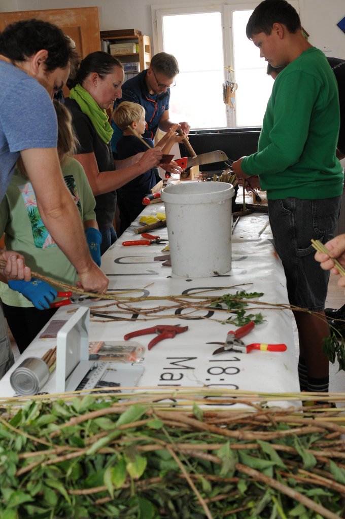 Es wurden mit Linda Ollmann Tonziegel getöpfert, Markhölzer und Markstängel fein säuberlich gesägt und abgeschliffen und ein massiver Robinienstamm vorgebohrt. Nur mit der Hilfe aller Anwesenden war das möglich, deswegen wurden kurzerhand auch Andreas Wally von der Gemeinde und der Fotograf Peter Steidl eingespannt.