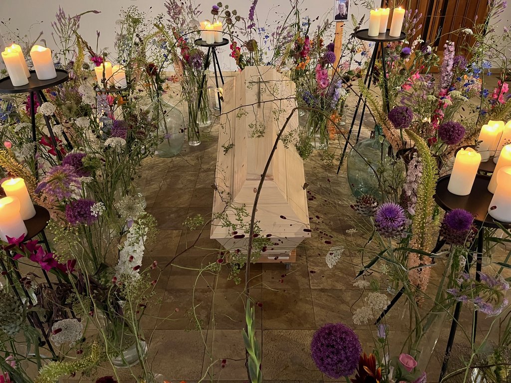 Hermann hat für und mit Blumen gelebt. Und so hat Tochter Anneliese mit ihrem Team unseren Verstorbenen in der Leichenhalle in eine wunderschöne Blumenwiese gebettet.
