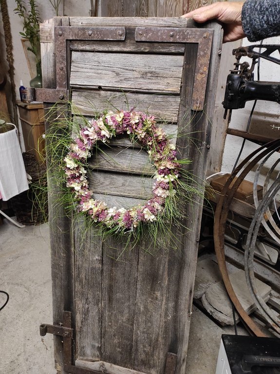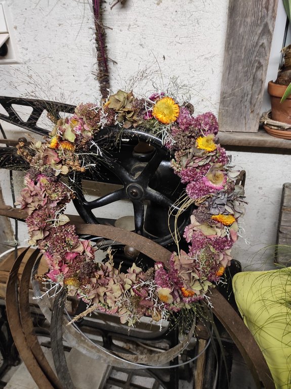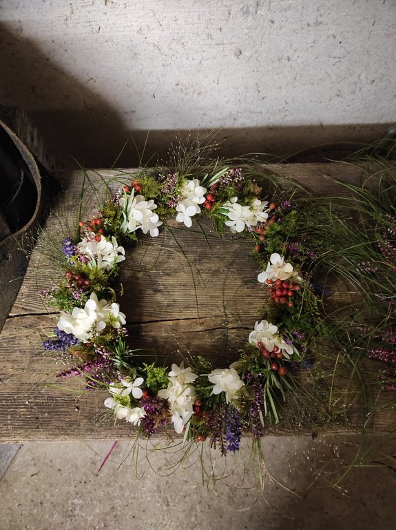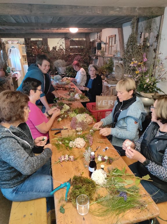 Mit den schönen Blumen, Blättern, Früchten und Gräsern des Herbstes wurden mit Anleitung von Christiane schöne Kränzle gebunden.