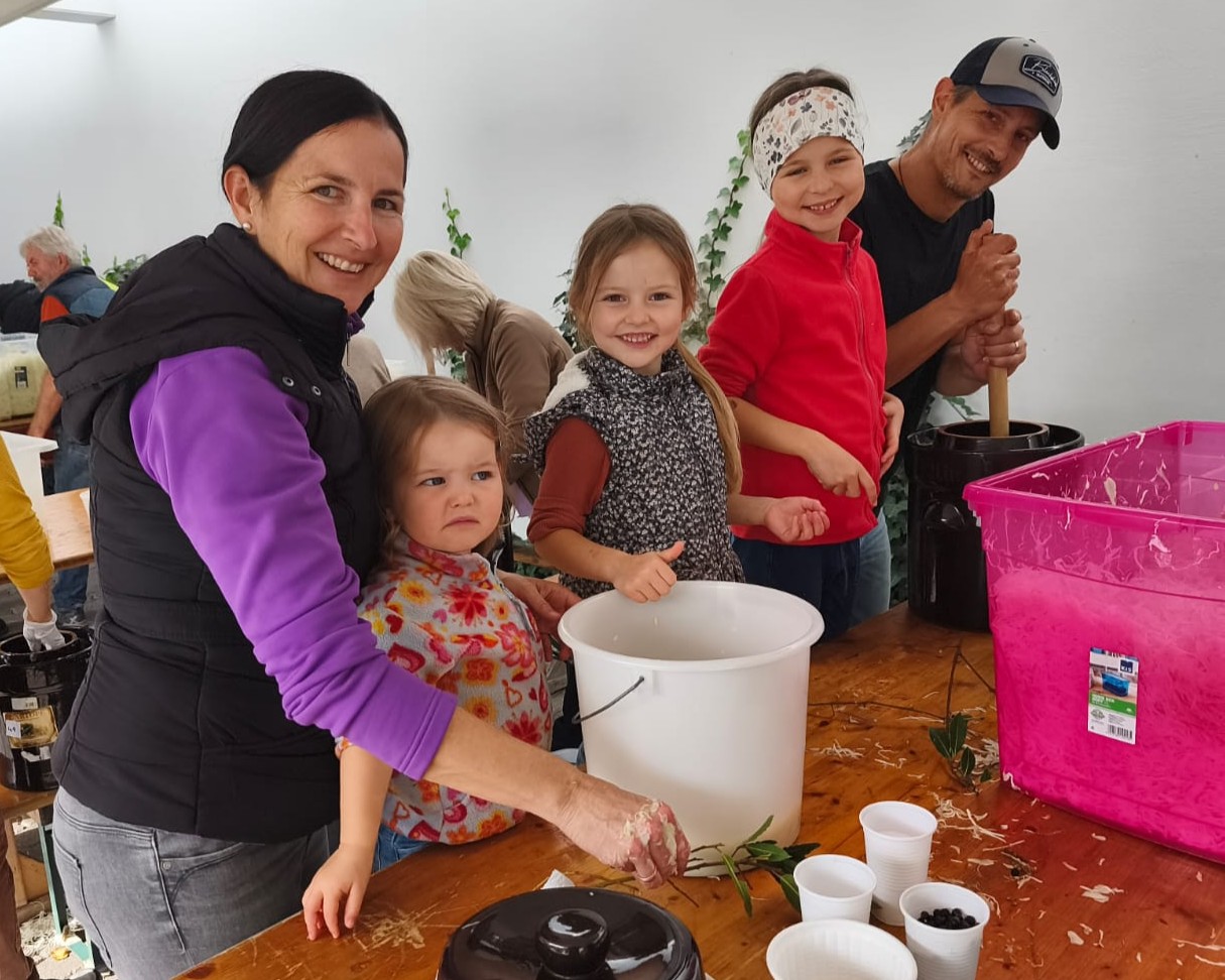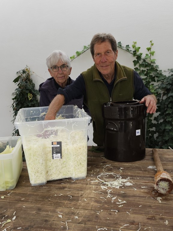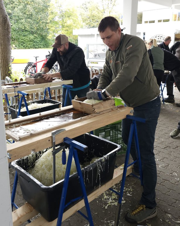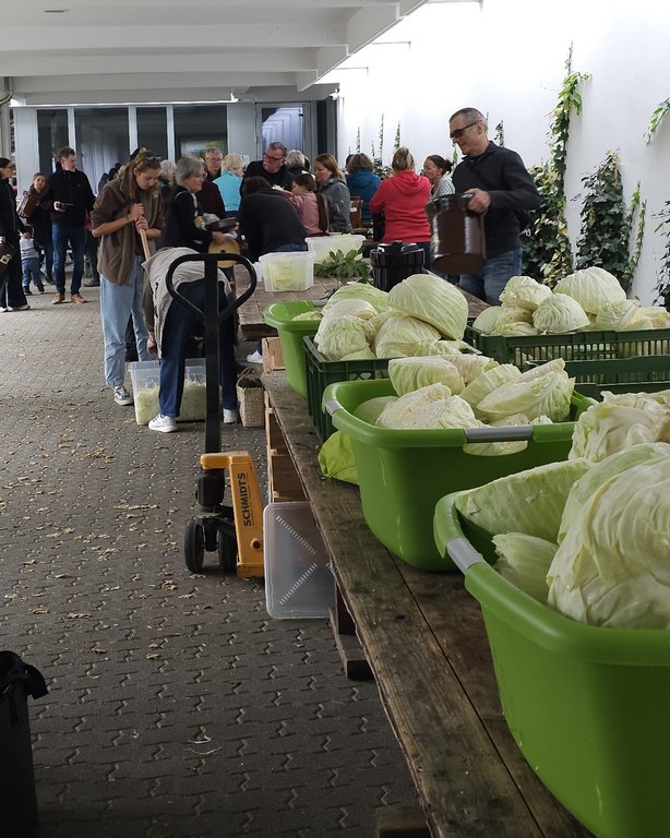 Besonders erfreulich war die große Teilnahme: 43 Anmeldungen, ein neuer Rekord für den Verein! Insgesamt wurden rund 500 Kilogramm Kraut verarbeitet, die anschließend in 45 Gärtöpfen und Gläsern ihren Platz fanden. So konnte jede Familie ein Stück hausgemachter, gesunder Vorrat mit nach Hause nehmen.