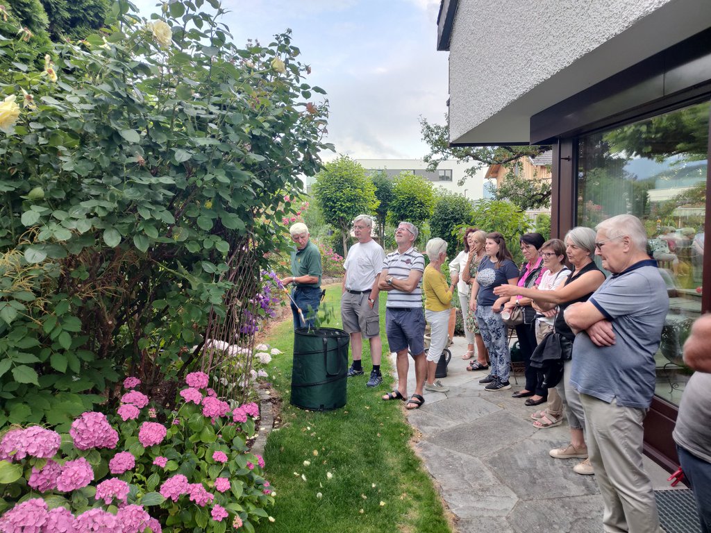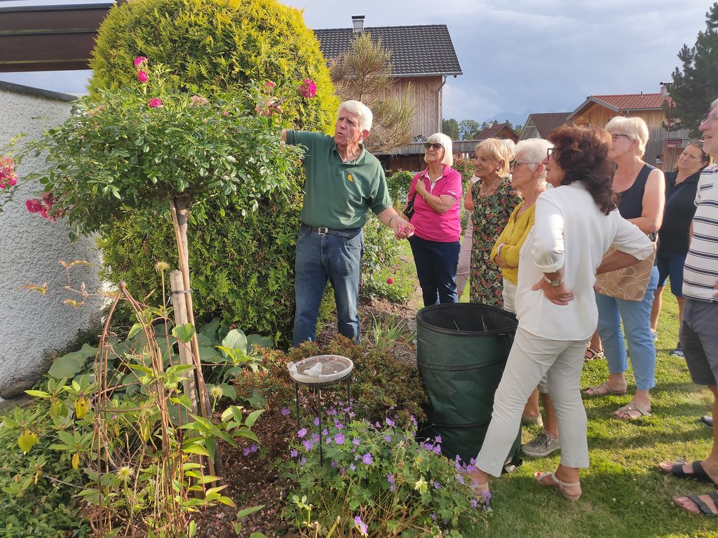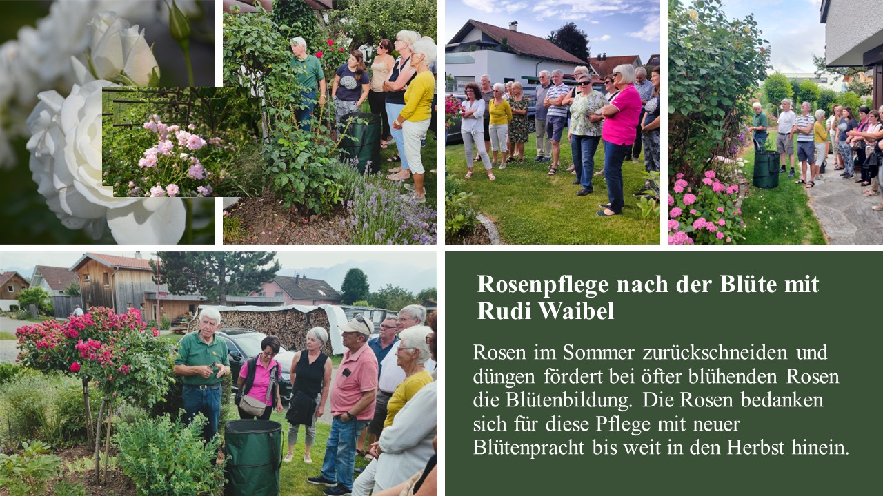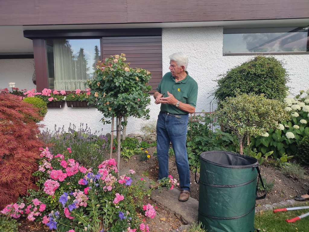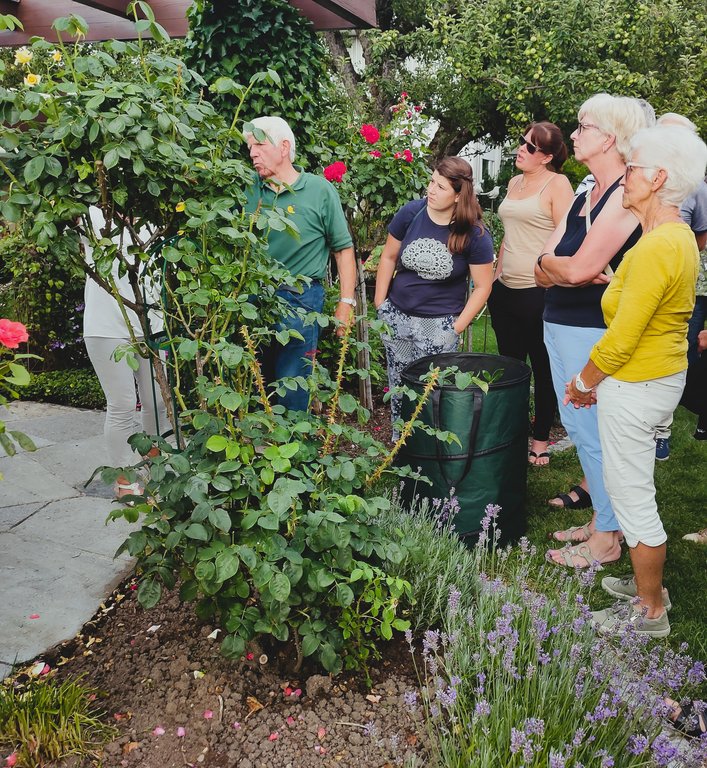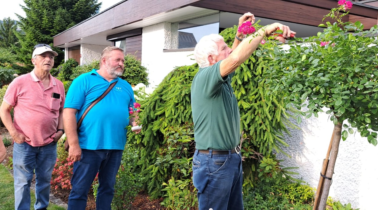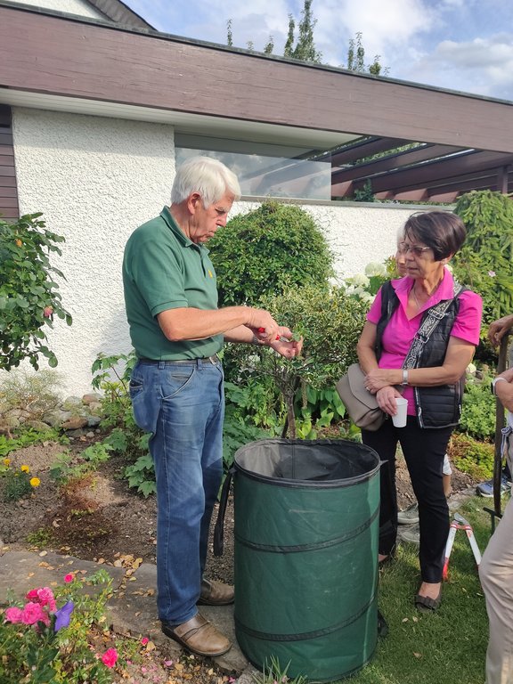 Rosen im Sommer zurückschneiden und düngen fördert bei öfter blühenden Rosen die Blütenbildung. Wo genau die Schere angesetzt werden muss und woran Wildtriebe erkannt werden, zeigte und erklärte uns Rudi Waibel. Wir erlebten einen wunderbaren Rosenschnittkurs bei Brigitte Gut in Sulz – Danke.