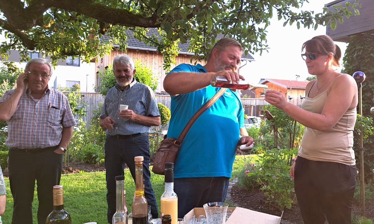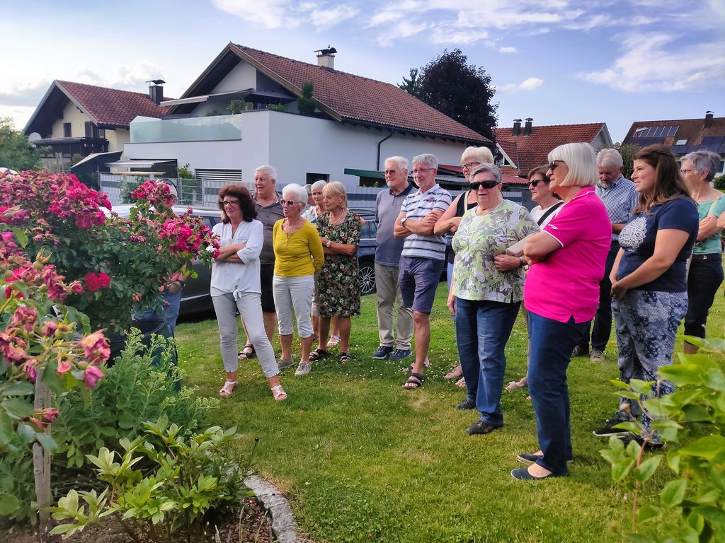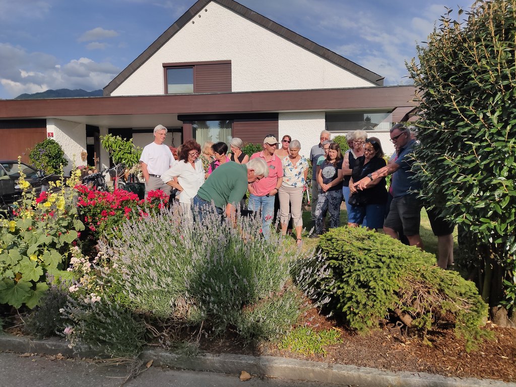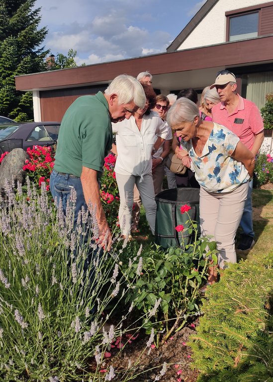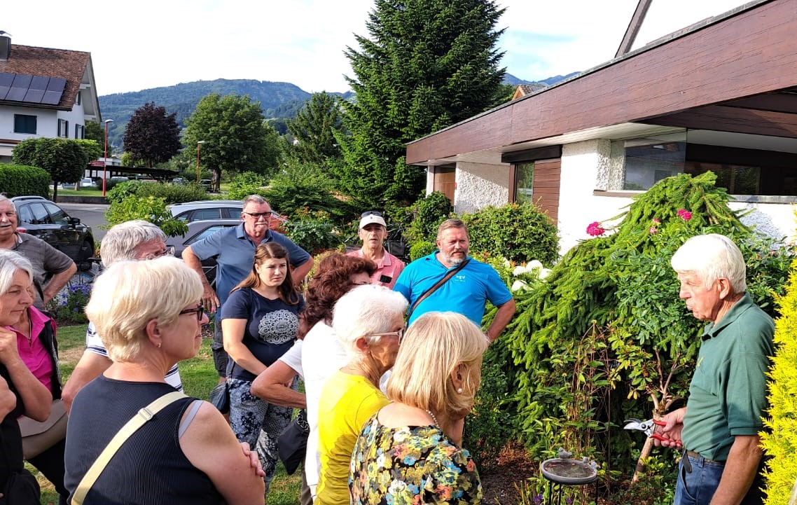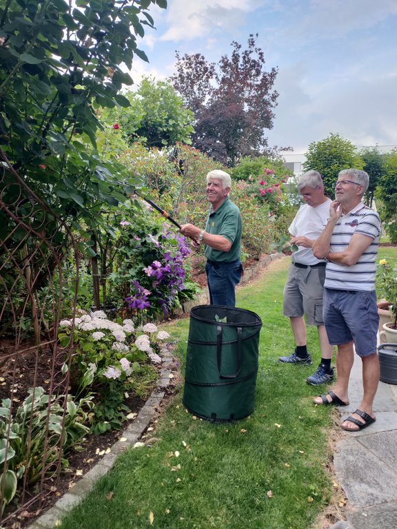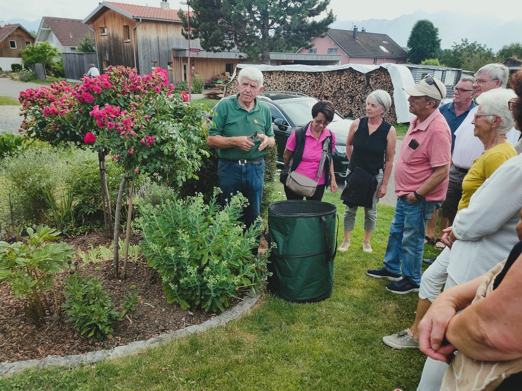 Rosen im Sommer zurückschneiden und düngen fördert bei öfter blühenden Rosen die Blütenbildung. Wo genau die Schere angesetzt werden muss und woran Wildtriebe erkannt werden, zeigte und erklärte uns Rudi Waibel. Wir erlebten einen wunderbaren Rosenschnittkurs bei Brigitte Gut in Sulz – Danke.