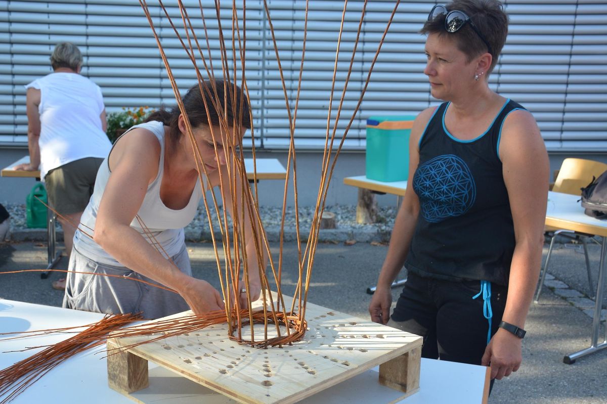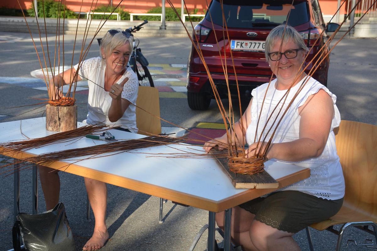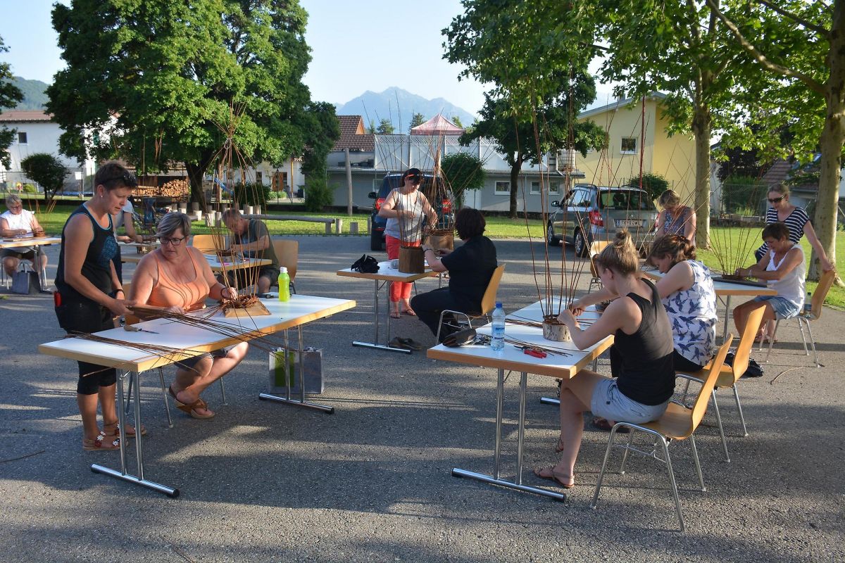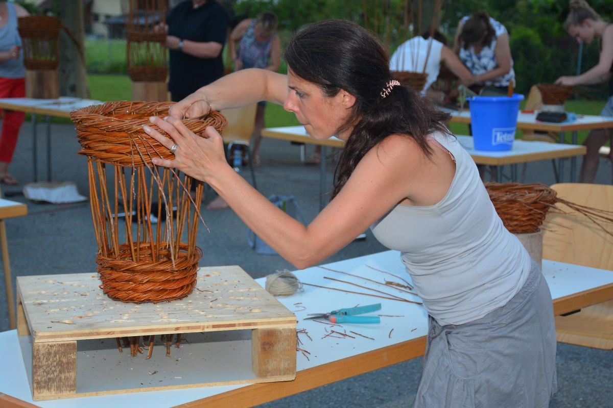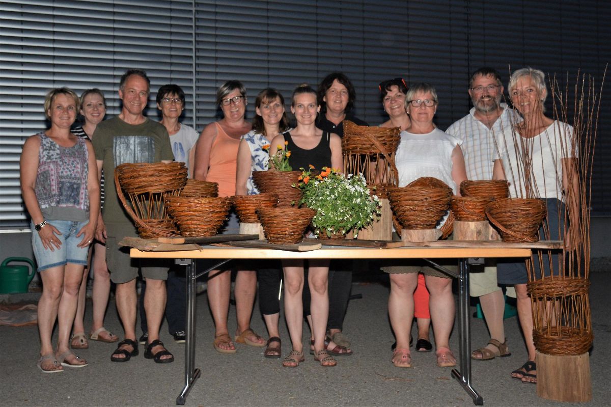 Am Dienstag, den 25.6.2019 fand bereits der 4. Flechtkurs mit Renate und Sigrid auf dem Schulhof der Volksschule Sulz statt. Bei herrlich heißen Temperaturen wurden aus vorbereiteten Weidenruten und Holzunterlagen Pflanzgefäße und Windlichter geflochten. Die TeilnehmerInnen waren bei bester Laune, natürlich wegen des großartigen Wetters und auch, weil die meisten schon wussten, dass wieder wunderschöne Objekte gefertigt werden.