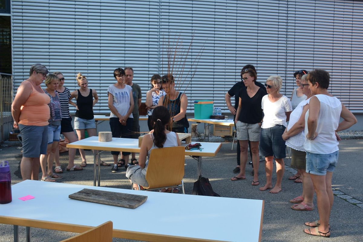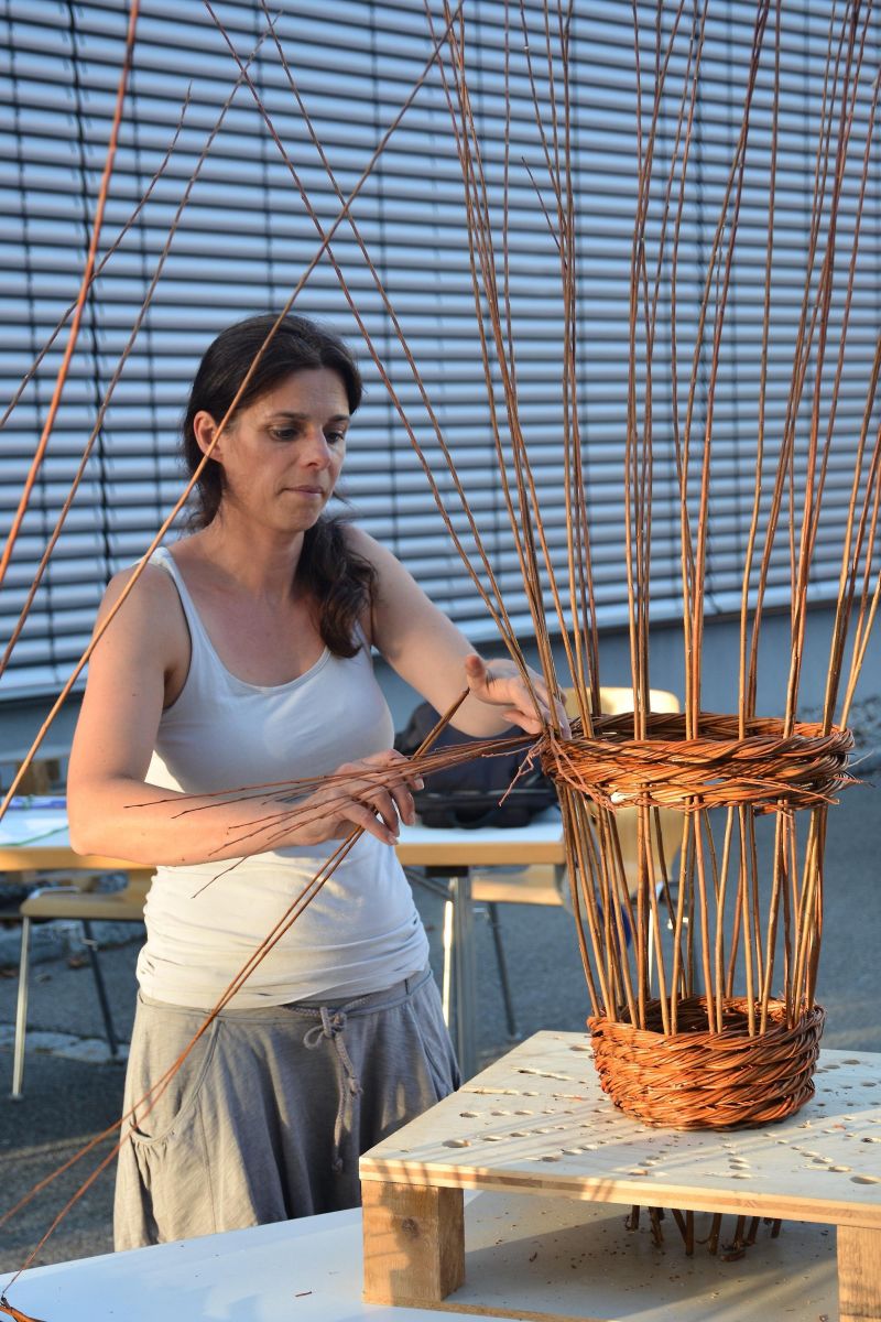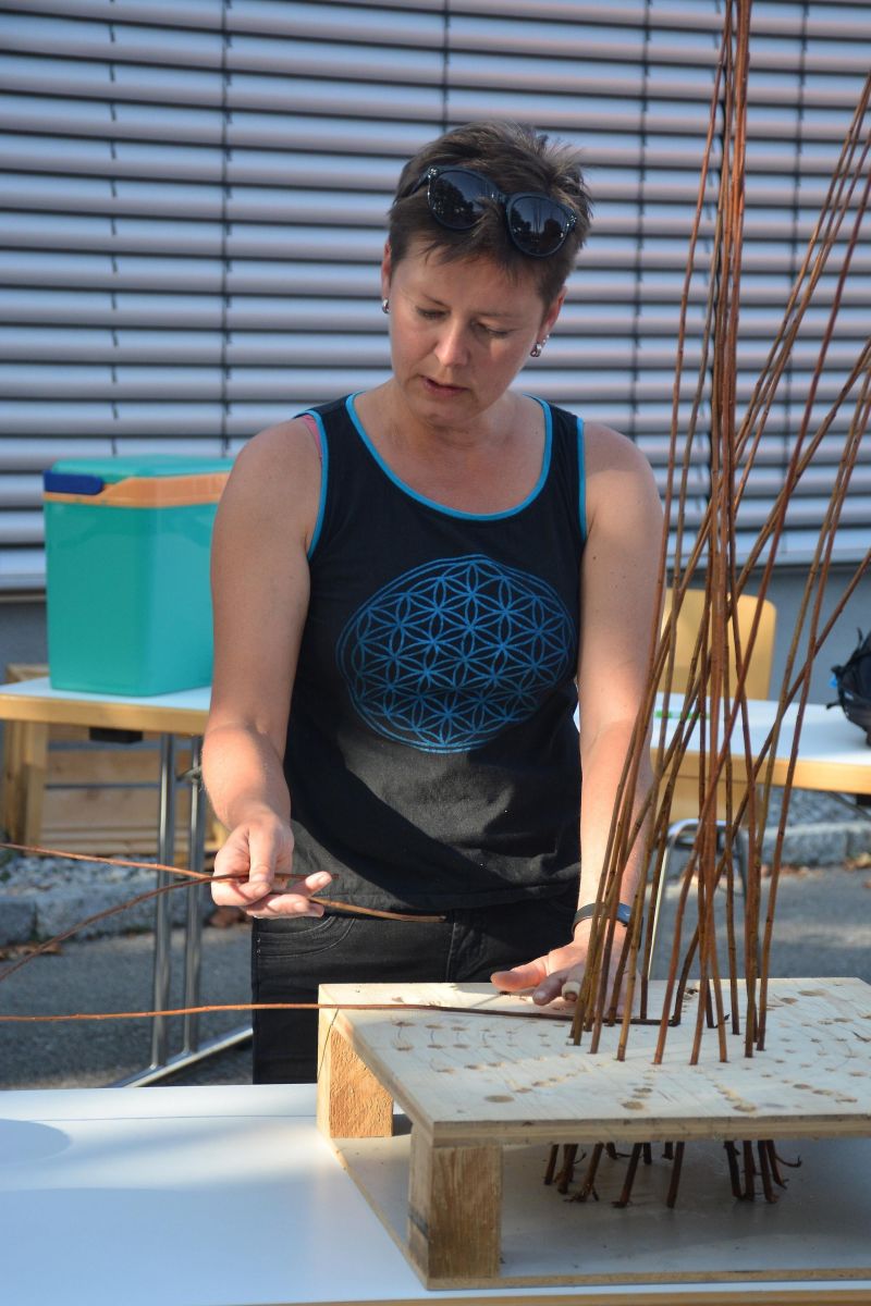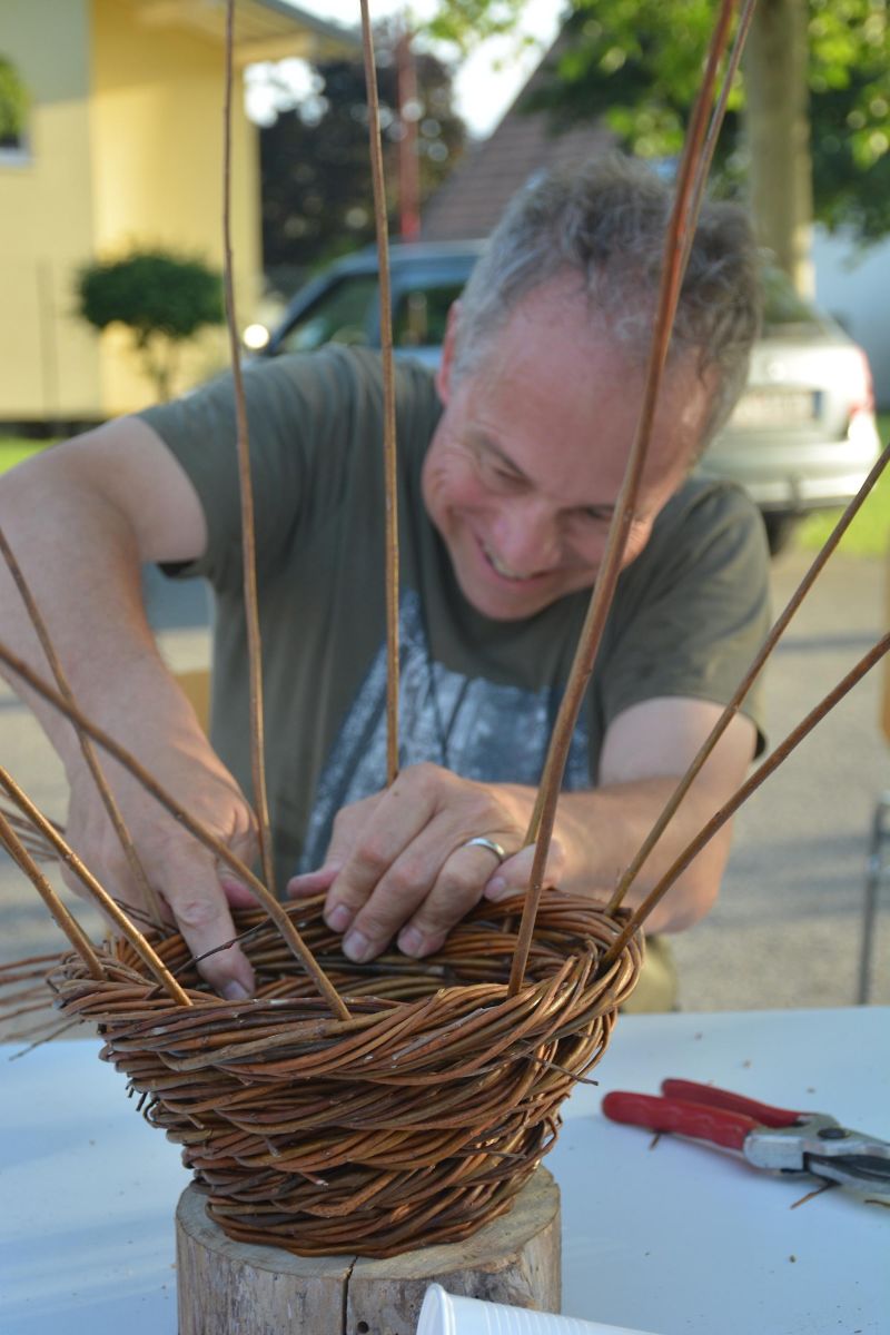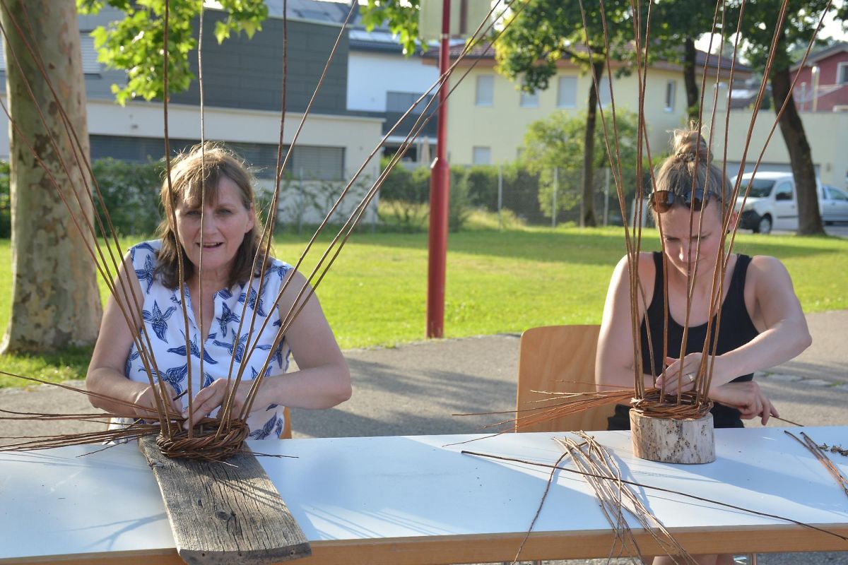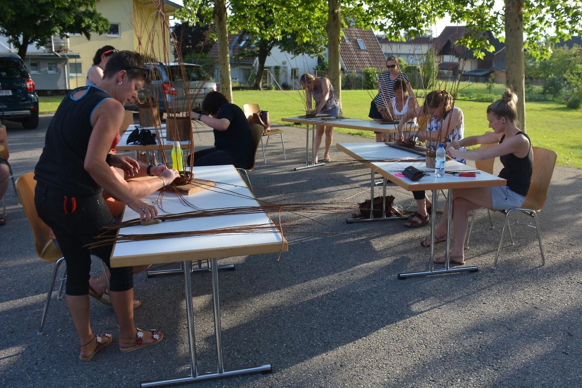 Am Dienstag, den 25.6.2019 fand bereits der 4. Flechtkurs mit Renate und Sigrid auf dem Schulhof der Volksschule Sulz statt. Bei herrlich heißen Temperaturen wurden aus vorbereiteten Weidenruten und Holzunterlagen Pflanzgefäße und Windlichter geflochten. Die TeilnehmerInnen waren bei bester Laune, natürlich wegen des großartigen Wetters und auch, weil die meisten schon wussten, dass wieder wunderschöne Objekte gefertigt werden.