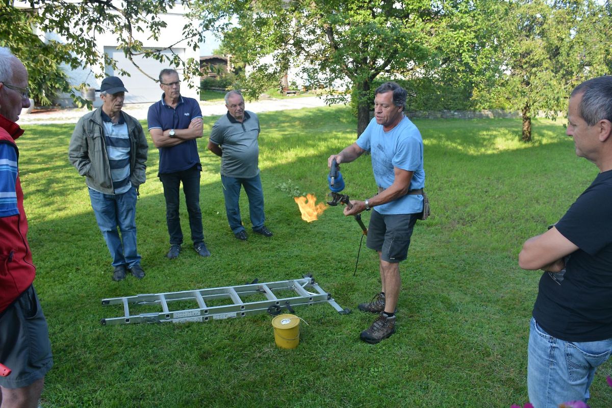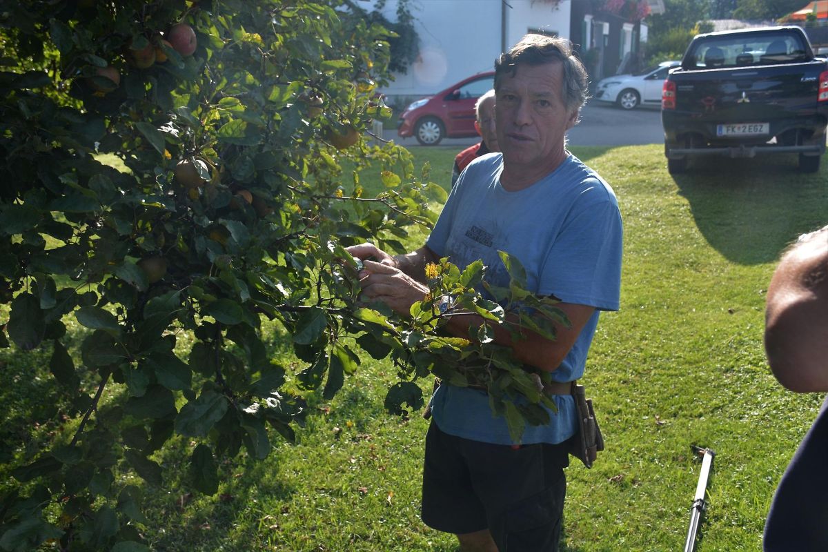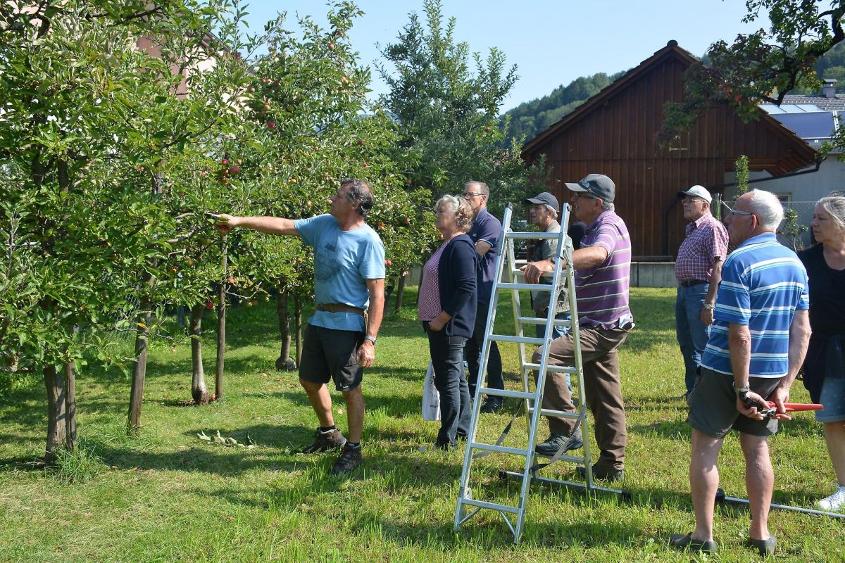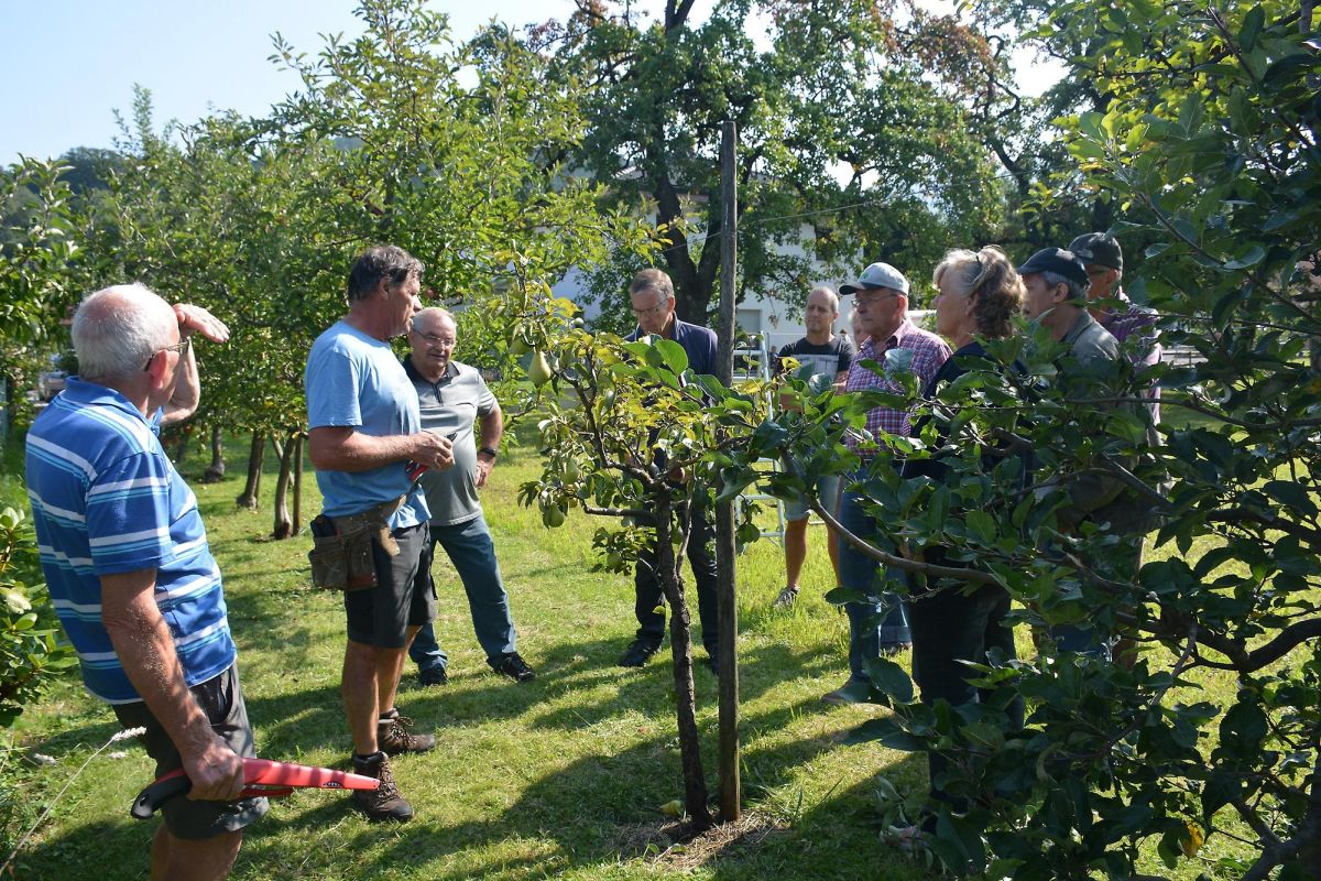 Lothar Lins zeigte uns an Hochstamm-, Halbstamm- und Spindel-Bäumen den richtigen Sommerschnitt, bei dem wir auch gleich selbst unser gelerntes umsetzen konnten.