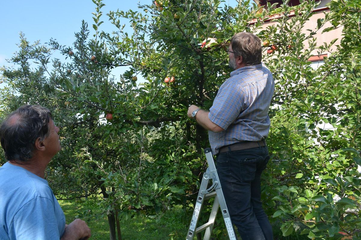 Ein Boskok voll mit Äfeln wurde besichtigt und besprochen, ein Pfirsichbaum an der Hauswand, ein Apfelbaum und Johannisbeeren wurden gleich fachgerecht geschnitten.