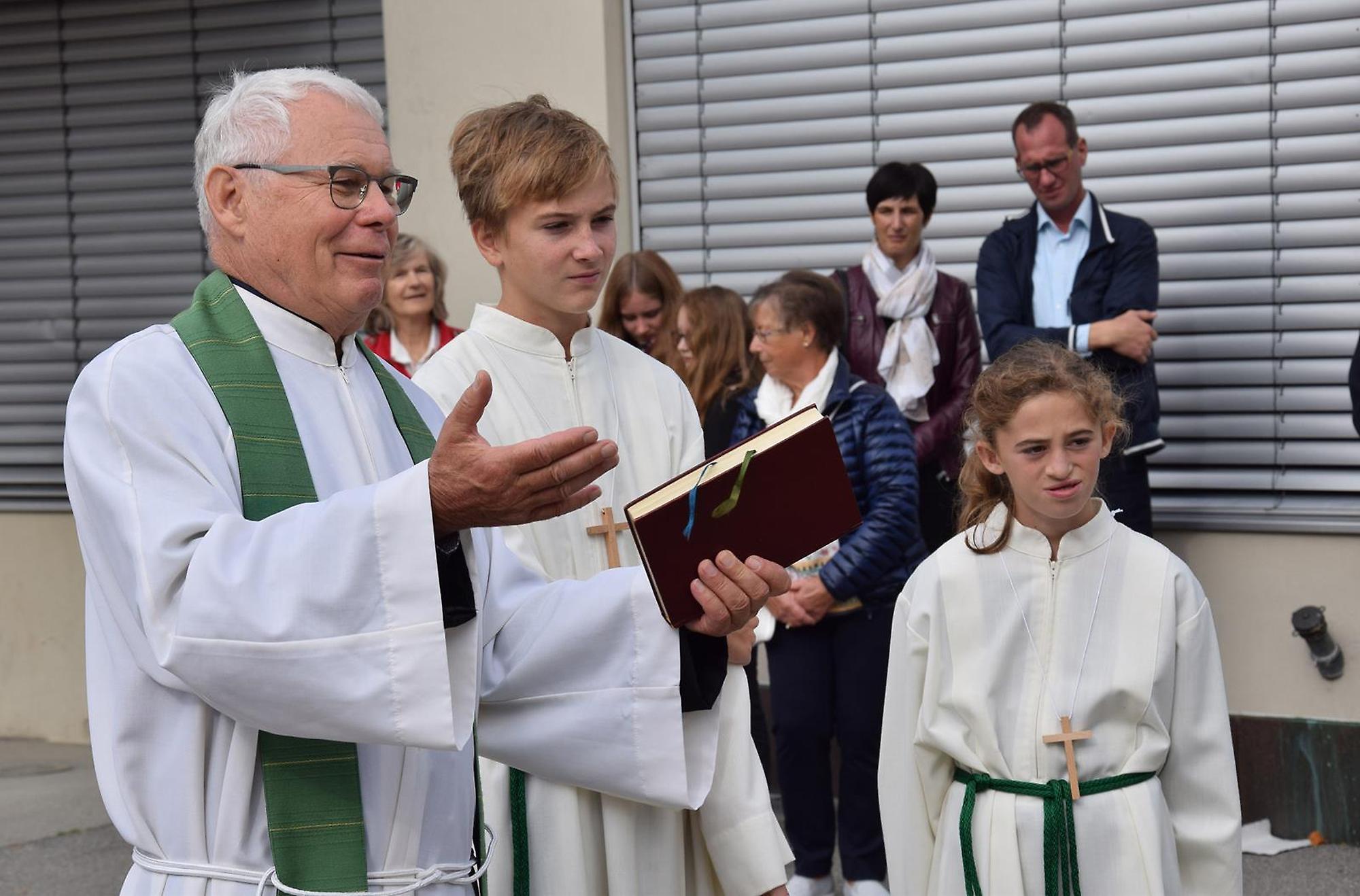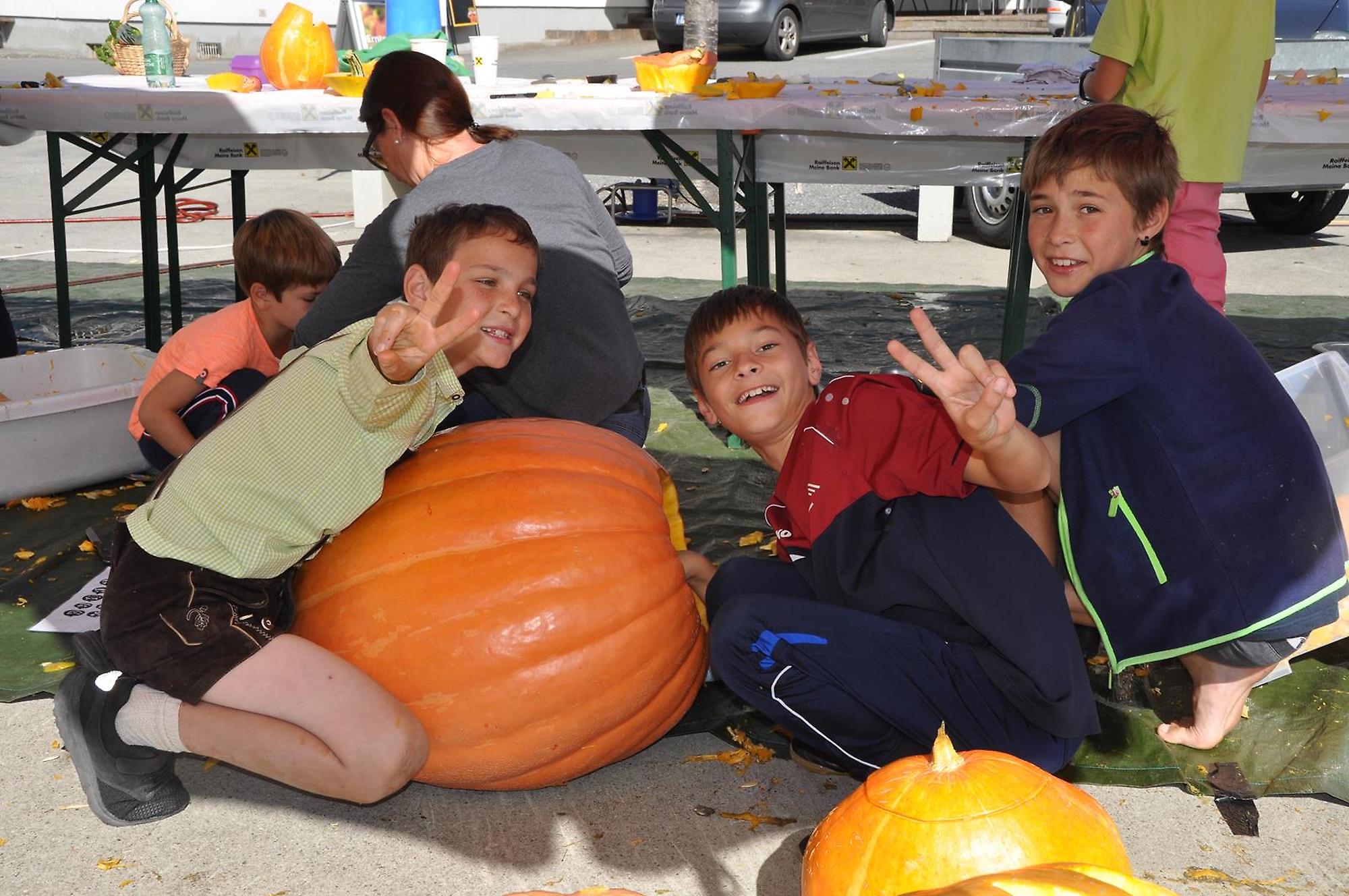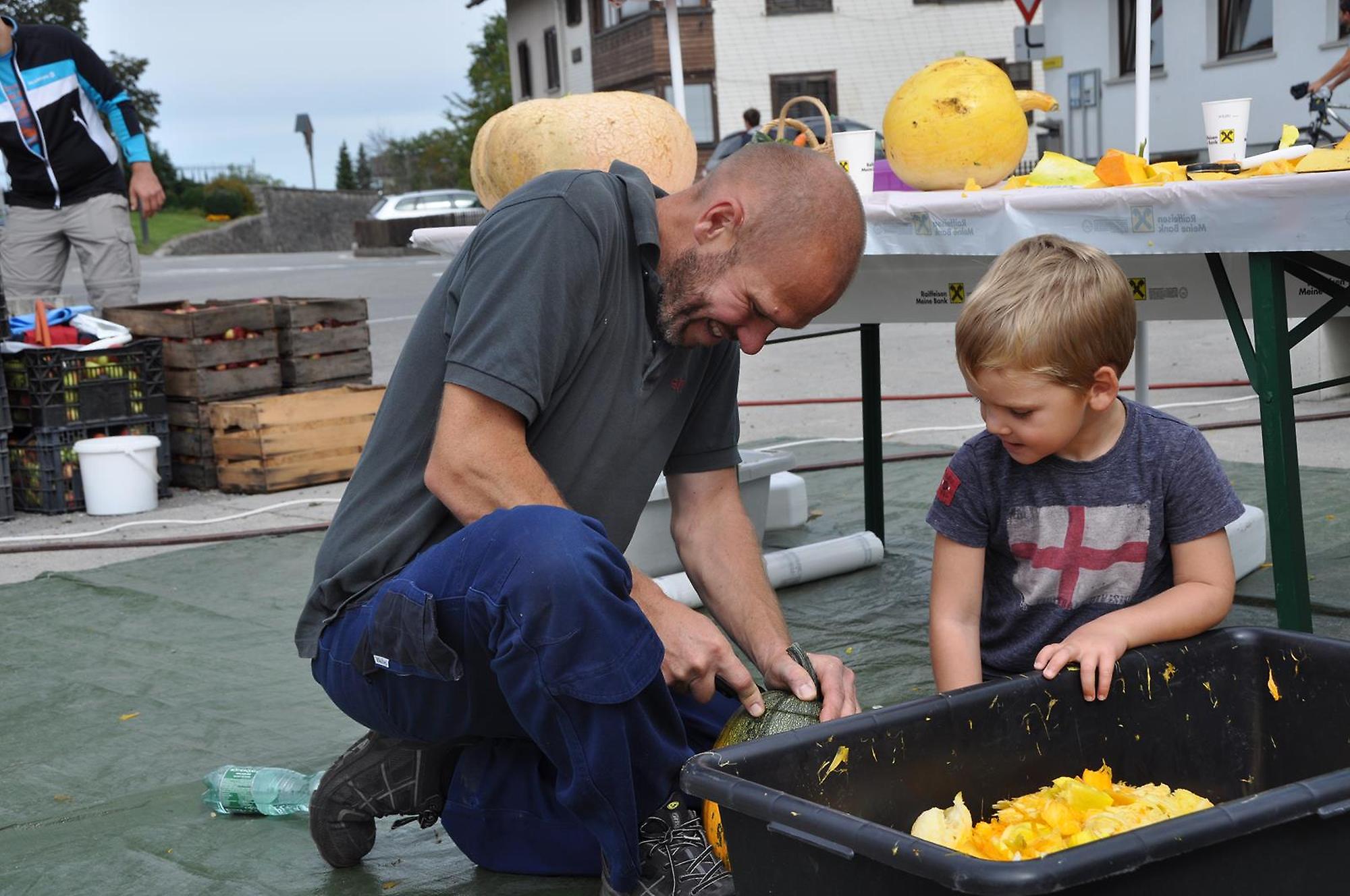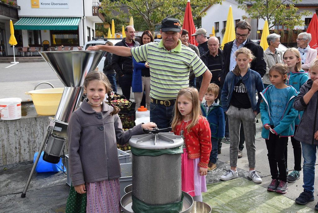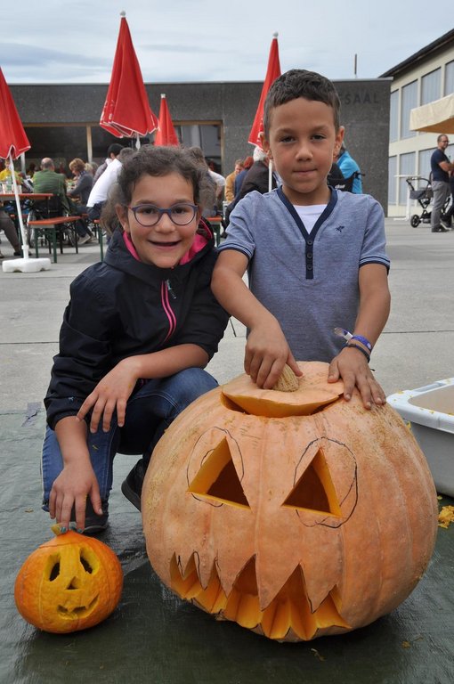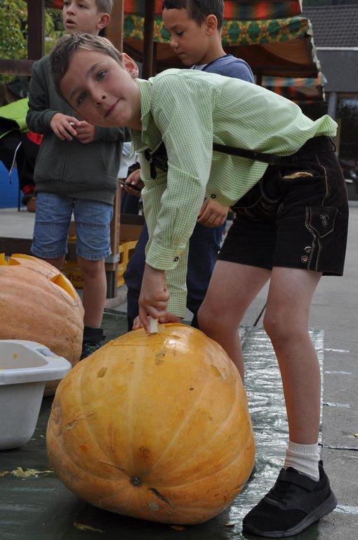 Nach dem Festgottesdienst in der Kirche wurden die neue Obstmühle und Mostpresse von Pfarrer Peter Haas gesegnet und anschließend von Günther, Ludwig und Rainer vorgeführt. Wir durften die Besucher mit herbstlichen Köstlichkeiten, wie einer selbstgemachten Kürbiscremesuppe und Ofenkartoffeln verwöhnen. Für Unterhaltung sorgten die Jungmusikanten des MV Übersaxen. Für die Kinder war das Kürbisschnitzen wohl das größte Highlight des Tages.