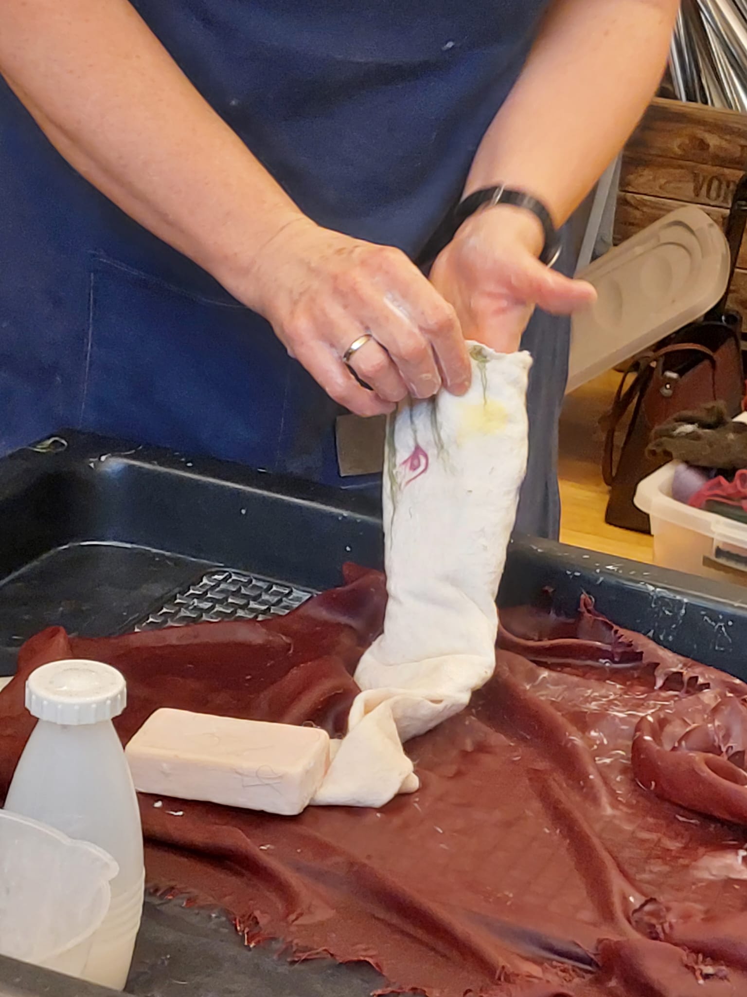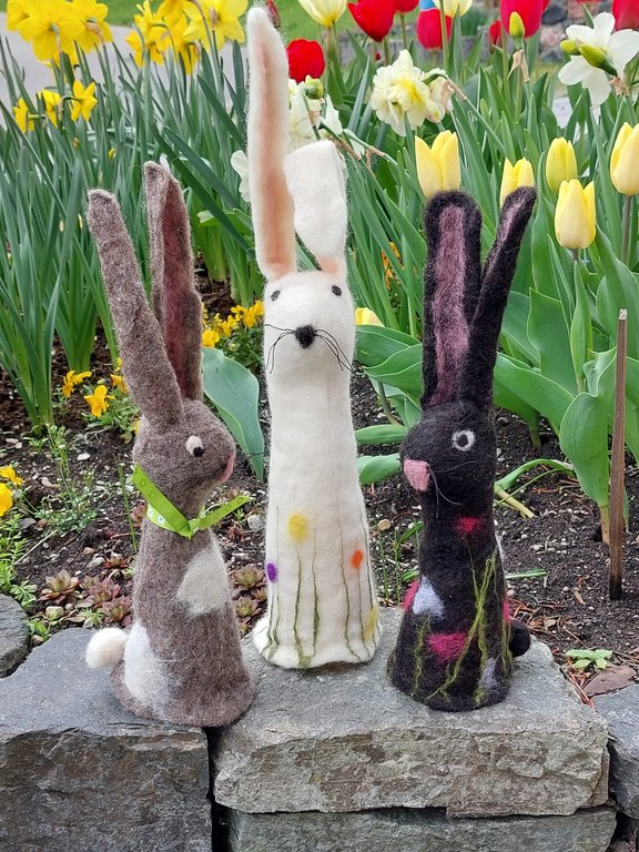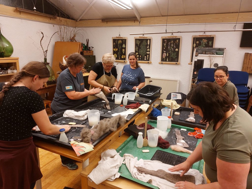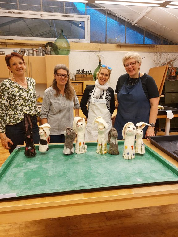 Sabine Bickel, Filzerin, Kräuterpädagogin und Floristin, hielt 2 Kurse je 3,5 Stunden zum Thema „Hasen filzen“ mit insgesamt 10 Teilnehmerinnen. Die Teilnehmerinnen lernten die verschiedenen Arbeitsschritte kennen und gingen mit viel Kreativität, Fantasie und Freude ans Werk. Es entstanden wunderschöne, originelle Osterhasen in verschieden Formen und Farben, gefleckt, mit und ohne Blumen.