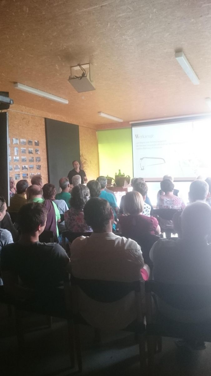 Bis über die Landesgrenze hinaus, ist Michael Gunz als Referent zum Thema Obstbau bekannt und so war auch der OFV-Schopf bis zum letzten Platz besetzt. Beim "Hock im Schopf" ist er speziell auf altes Wissen eingegangen. Dies ist teilweise bis in die heutige Zeit in Gebrauch und wurde auch weiterentwickelt. Leider ist vieles durch modernisierung auch verloren gegangen und somit nicht an nächste Generationen weitergegeben worden. Aufgrund der klimatischen, ökologischen und gesellschaftlichen Veränderungen wird jedoch die ursprünglich ressourcen- und umweltschonende Lebenmittelproduktion wieder an Bedeutung gewinnen. Davon ist der Referent überzeugt. Mit interessanten Bildern und mitgebrachtem Werkzeug hat Michael die frühere Arbeitsweise veranschaulicht.