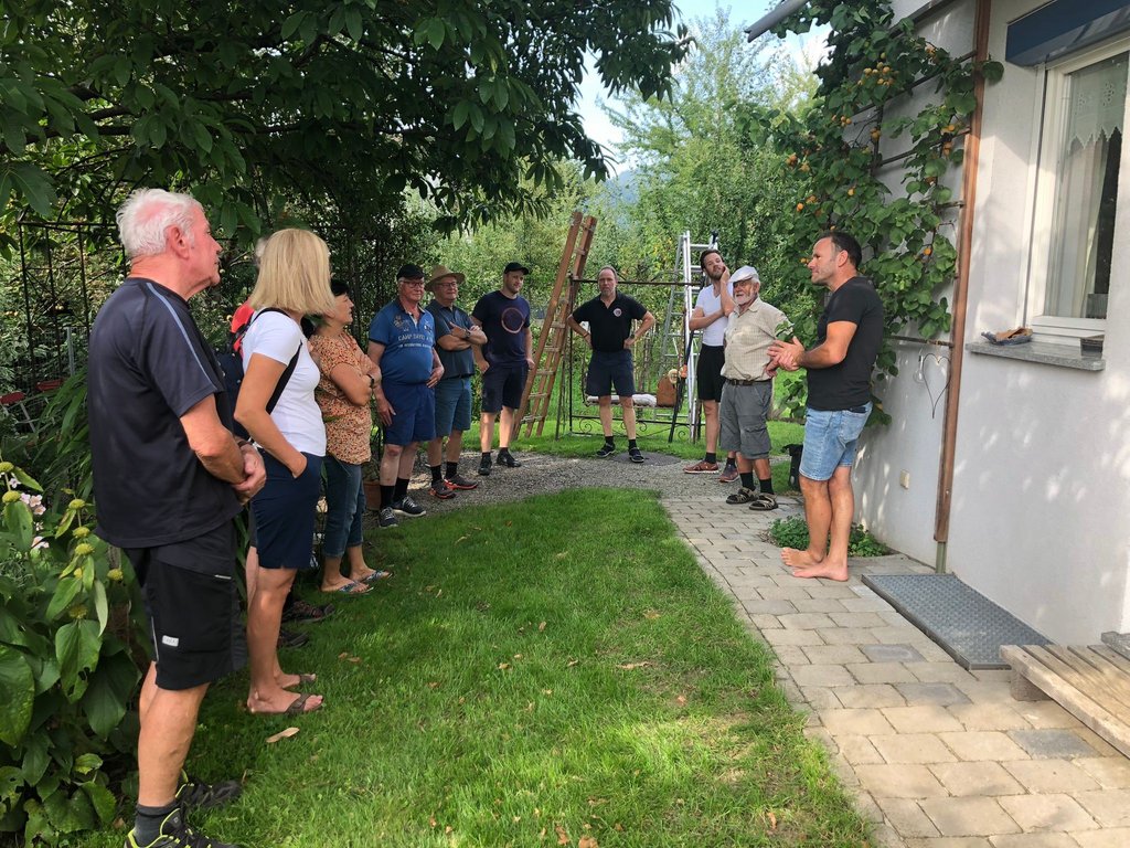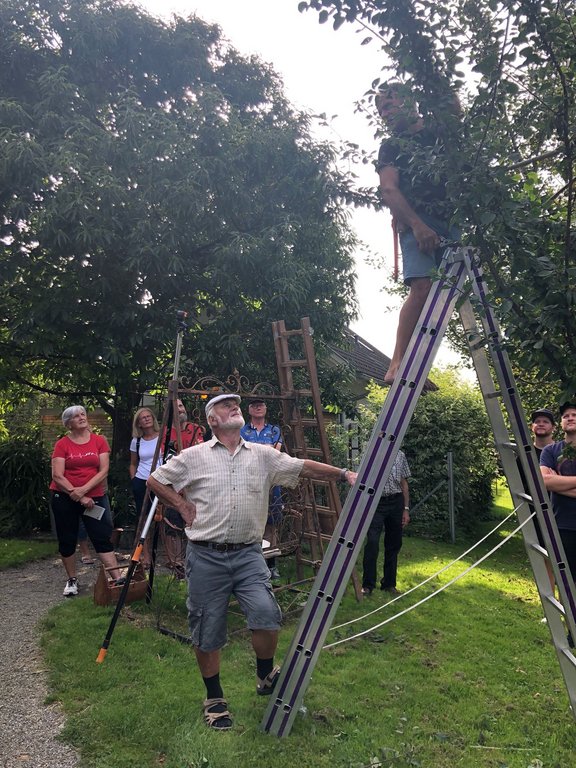 Zum Sommerschnittkurs versammelten sich 17 TeilnehmerInnen im Obstgarten des Baumwärters Michael Gunz.