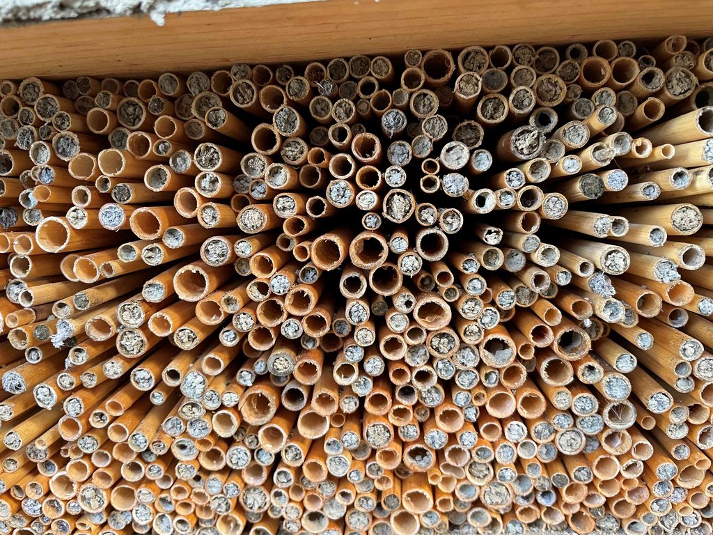 Für den richtigen Bau einer Nisthilfe benötigt man trockenes Hartholz wie z.B. Robinie, Eiche, Buche oder Esche, in die quer zur Faser- nicht ins Stirnholz – Löcher mit einem Durchmesser von 2 bis maximal 8 mm und einer Tiefe von 15 – 20 cm gebohrt wird. Weiden haben einen weichen Kern, der von Wildbienen sehr gerne angenommen wird. Auch Bambus oder Strohhalme eignen sich hervorragend. Unsaubere Eingänge mit Schleifpapier glätten, damit sich die Nützlinge nicht ihre Flügel verletzen.