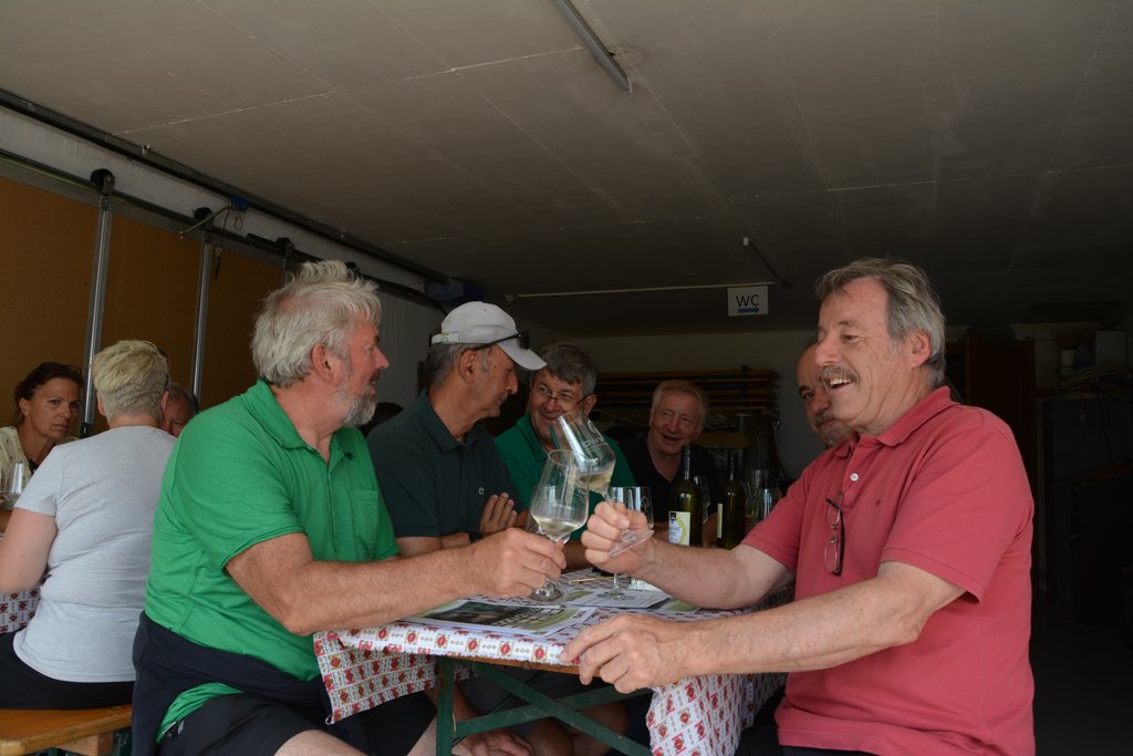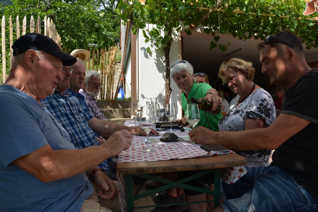 Robert Gohm kredenzt seine vorzüglichen Weine, die von den über 40 Teilnehmern bei einem sagenhaften Ausblick über das Walgau gerne verkostet werden.