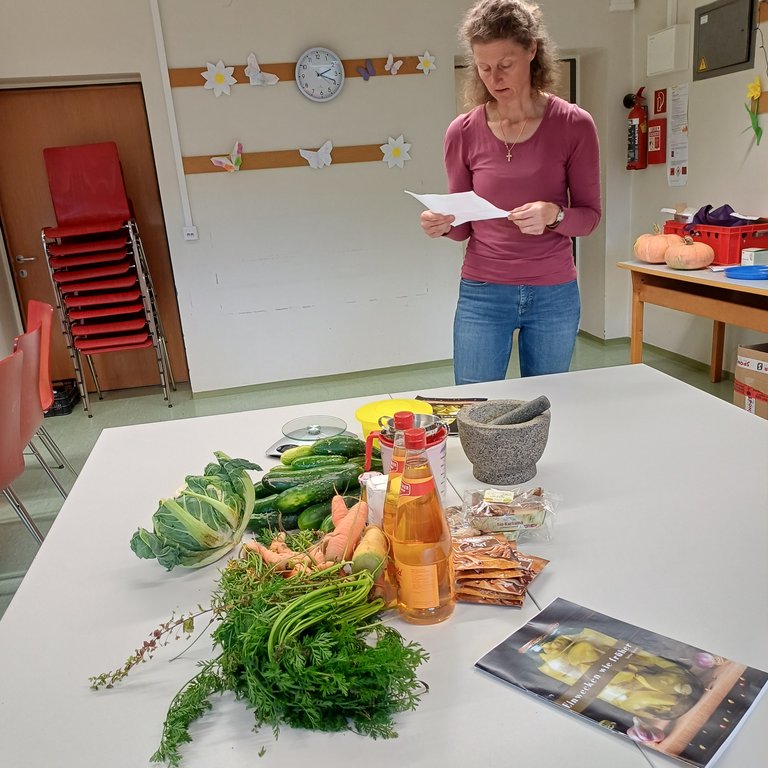 Im praktischen Teil wurde den ganzen Nachmittag über eifrig gearbeitet: Es wurde geschält, geschnitten, gekocht, gerührt und natürlich auch gekostet – unter anderem Kuchen im Glas, der großen Anklang fand. Für eine stärkende Pause sorgte eine frisch zubereitete Kürbissuppe, die allen schmeckte.