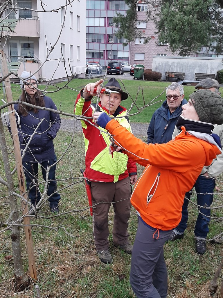 Nach der Arbeit am Hochstamm wechselten wir zum Schulobst Garten in den Bifang. Hier wurden Spindelbäume – von den Teilnehmenden – unter der fachkundigen Anleitung der drei Baumwärter, Lothar, Armin und Thomas geschnitten.